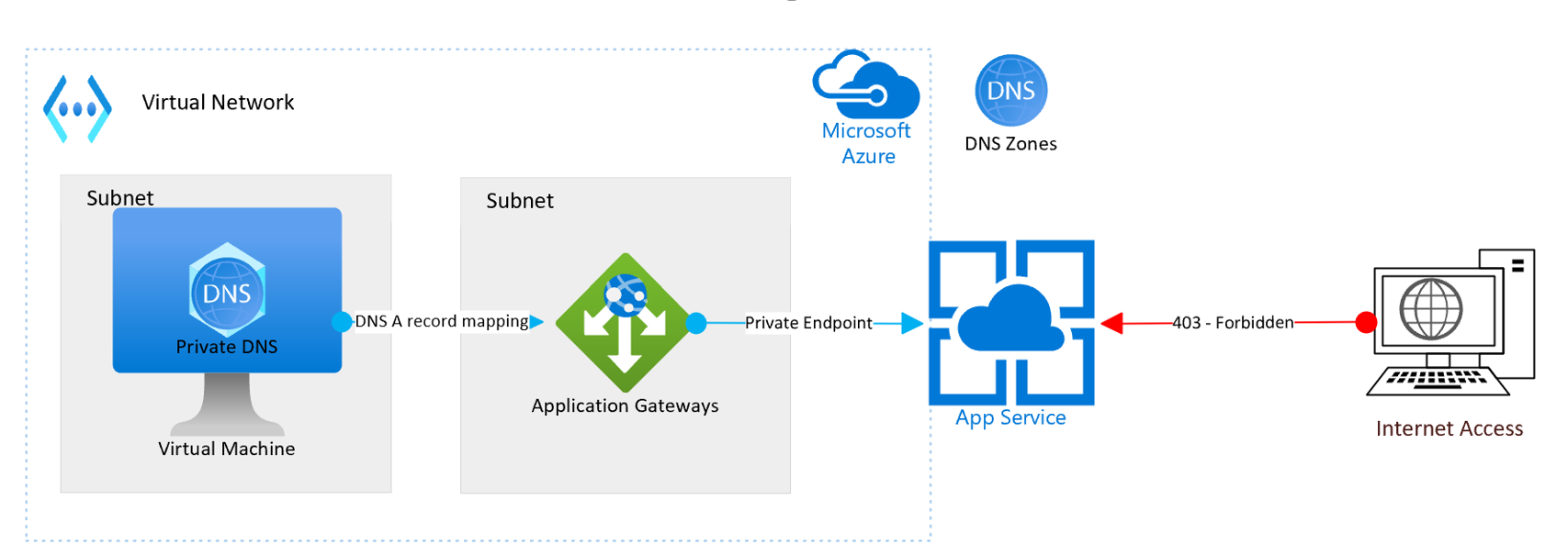 在Azure中,可以通过App Service快速部署,构建自定义站点(PaaS服务)。默认情况下,这些站点被访问URL都是面向公网,通过公网进行解析。为了最好的安全保障,是否可以有一种功能实现只能内网访问呢?并且为了在企业内部使用,还需要配置私有的自定义域名(如myapp.aaa)?