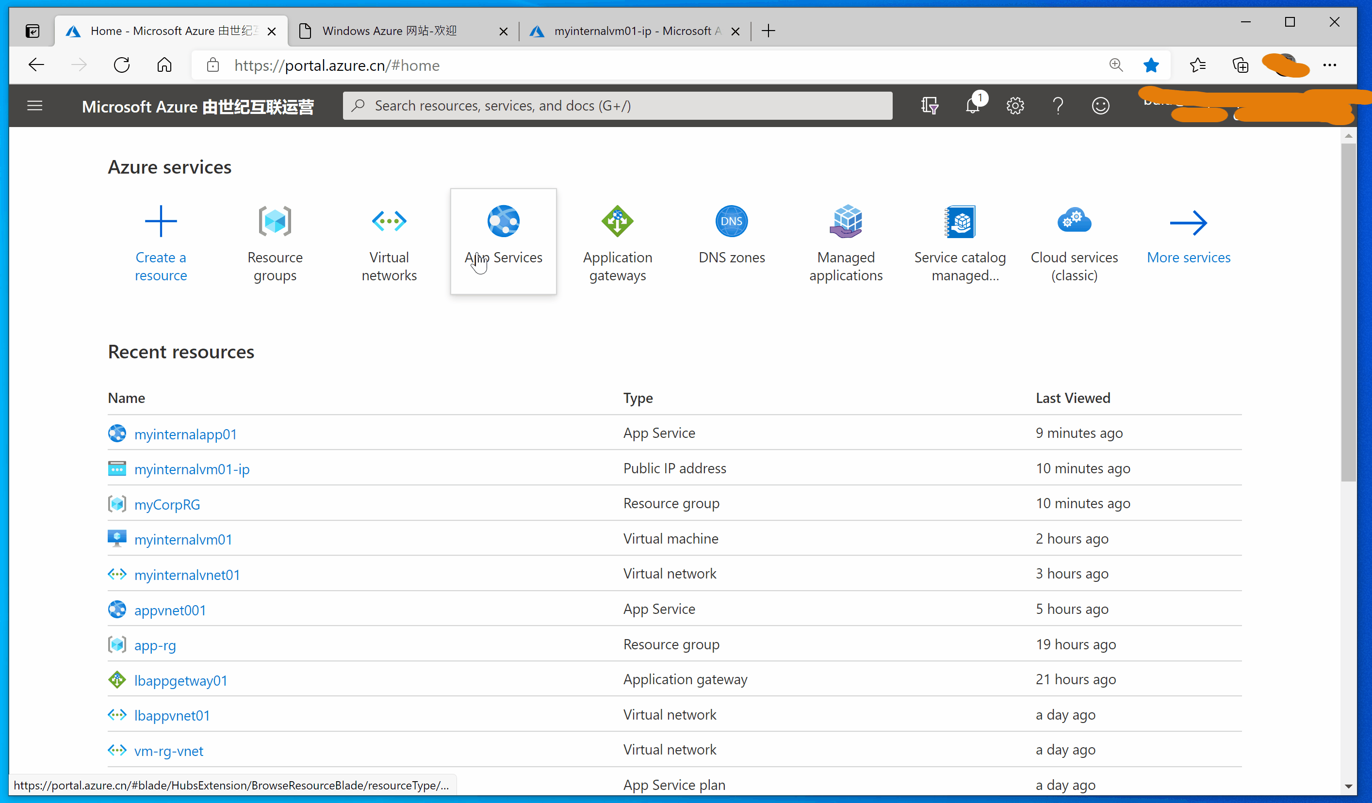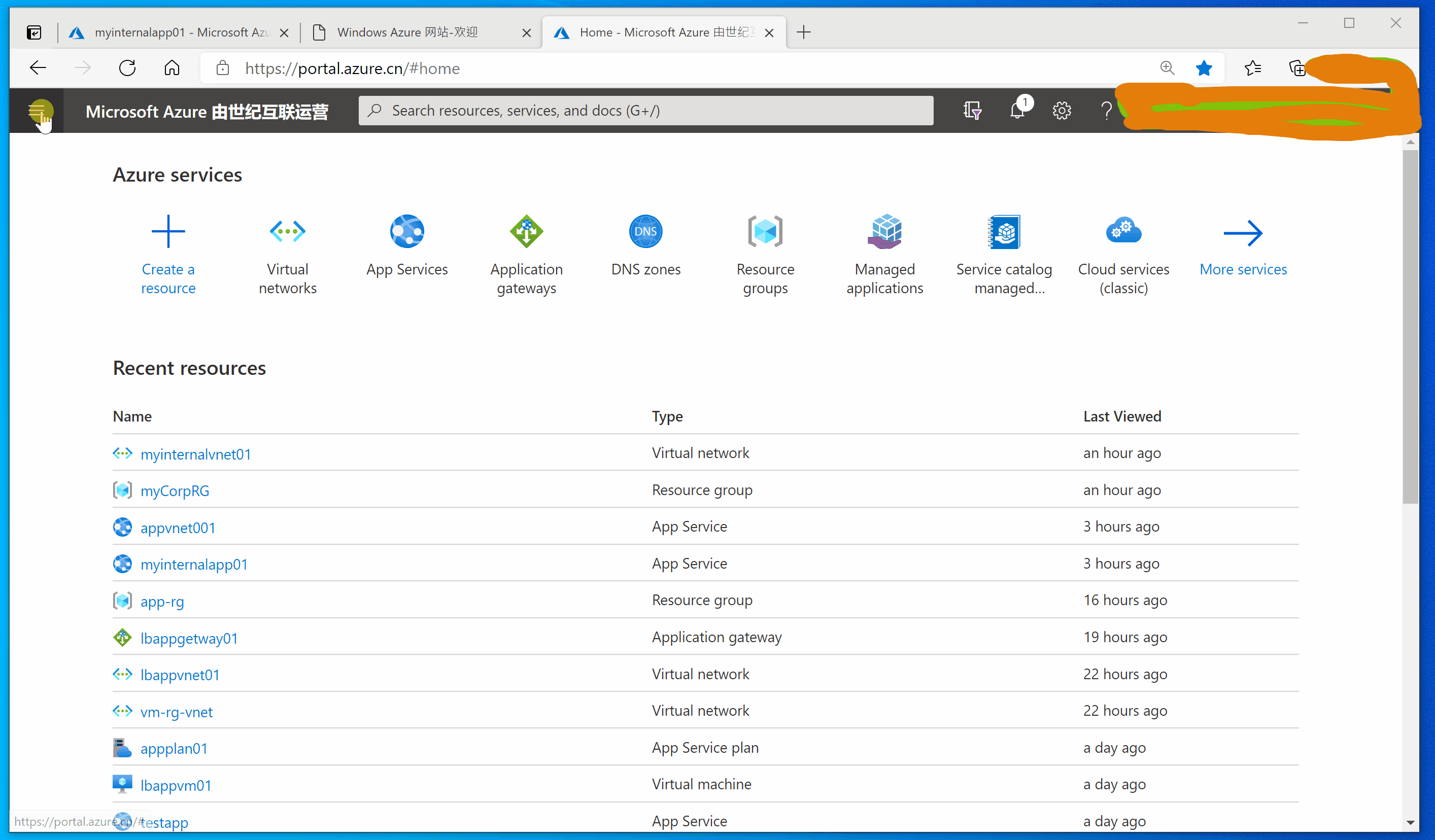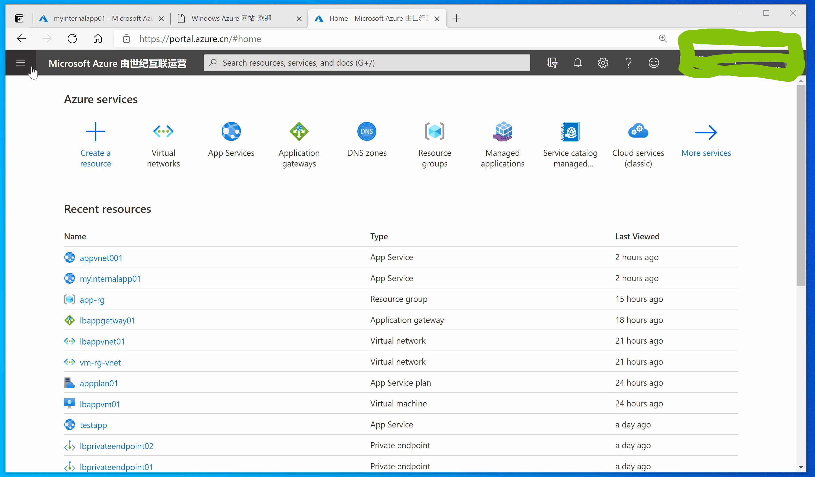 登录Azure门户(中国区): https://portal.azure.cn/