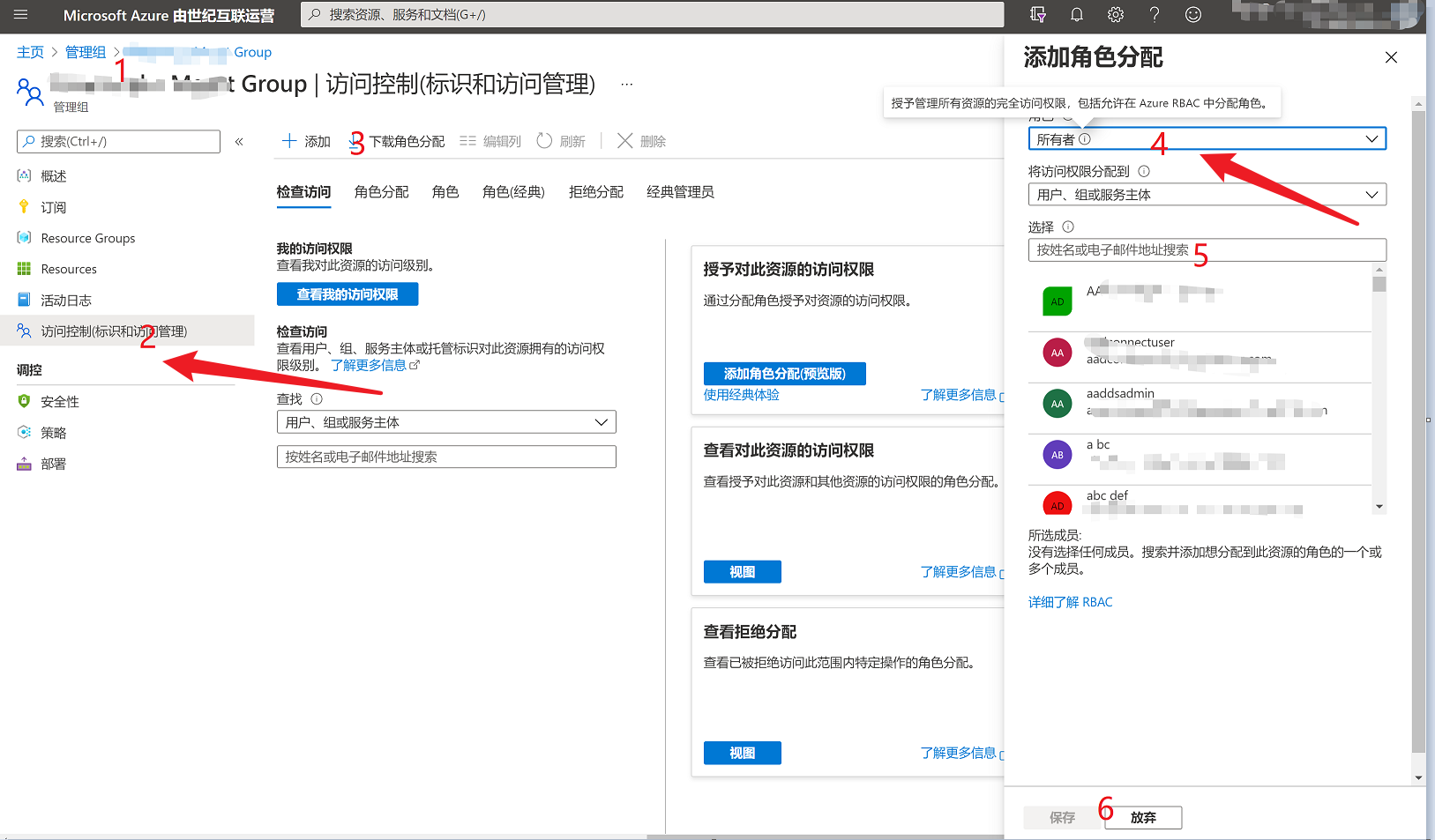 2)选择需要设置Owner的管理组,在“访问控制(标识和访问管理)”中添加“Owner所有者”角色