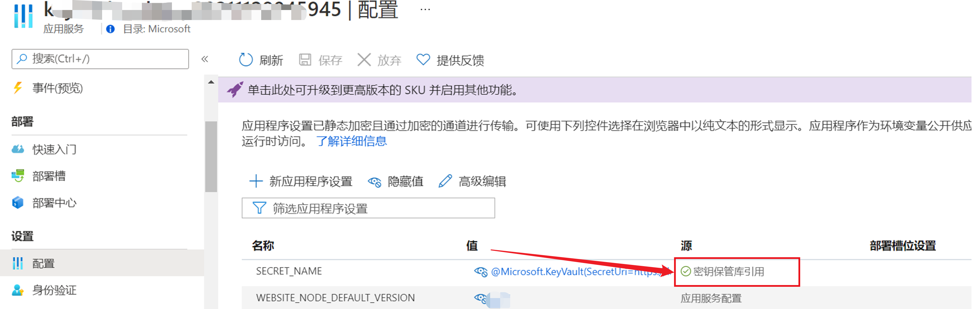4)回到App Service 配置页面,在应用程序配置中添加与Key Vault 中机密对应的信息, 完整的引用语句为:
