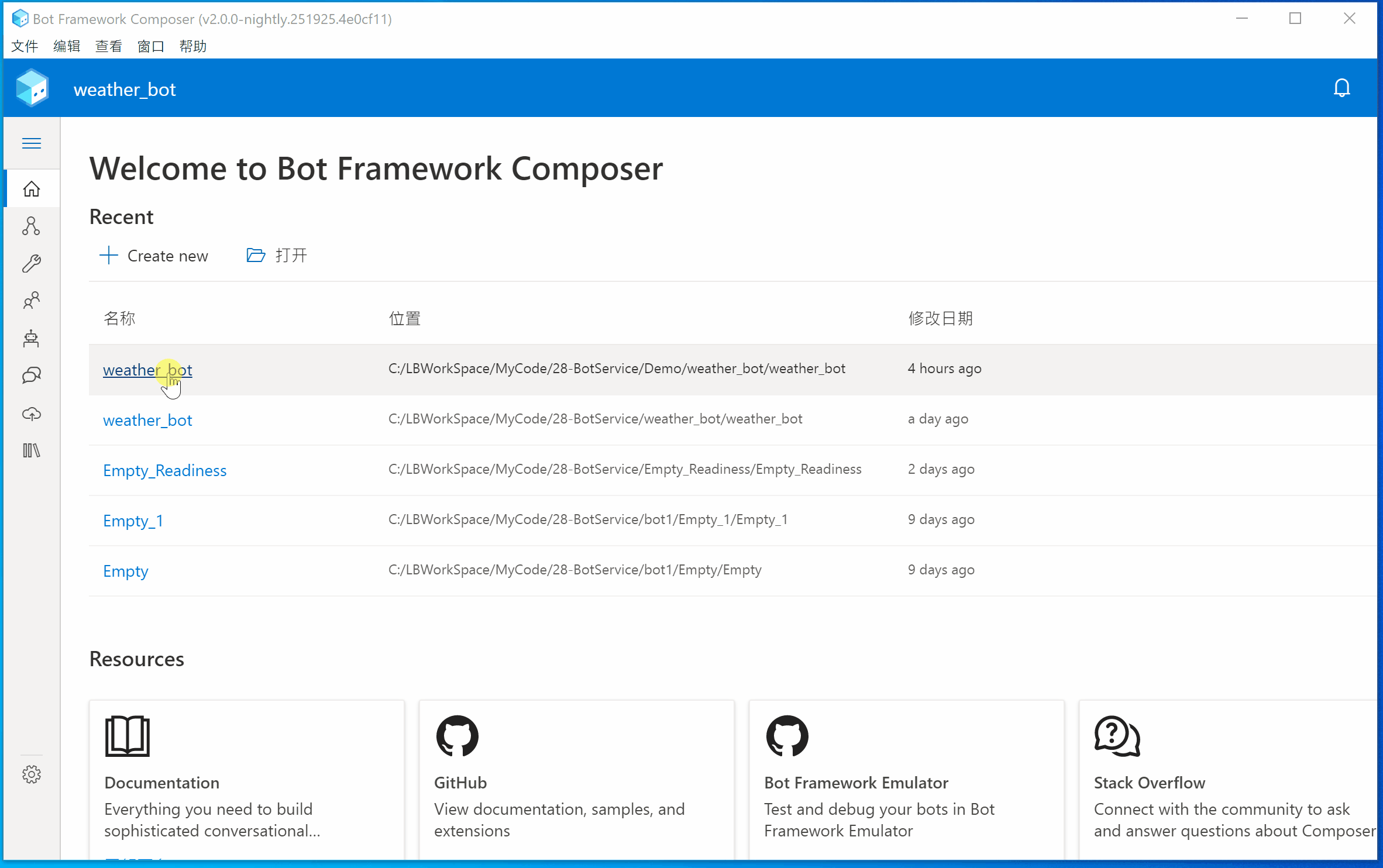 第一步:启动编辑器(Bot Composer) 并打开 weather_bot项目