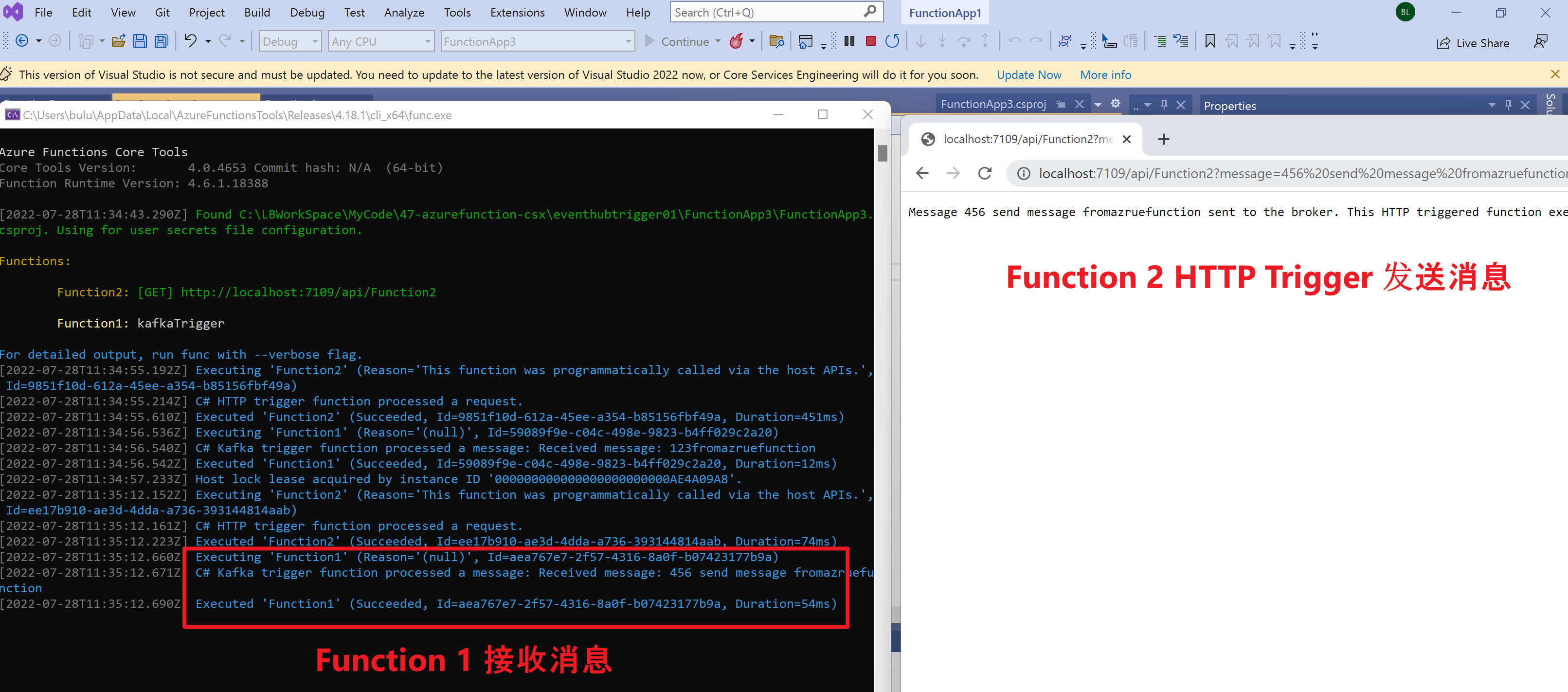 6:F5运行Function Project,使用HTTP Trigger的URL发送消息,然后用Kafka Trigger的函数接受消息。
