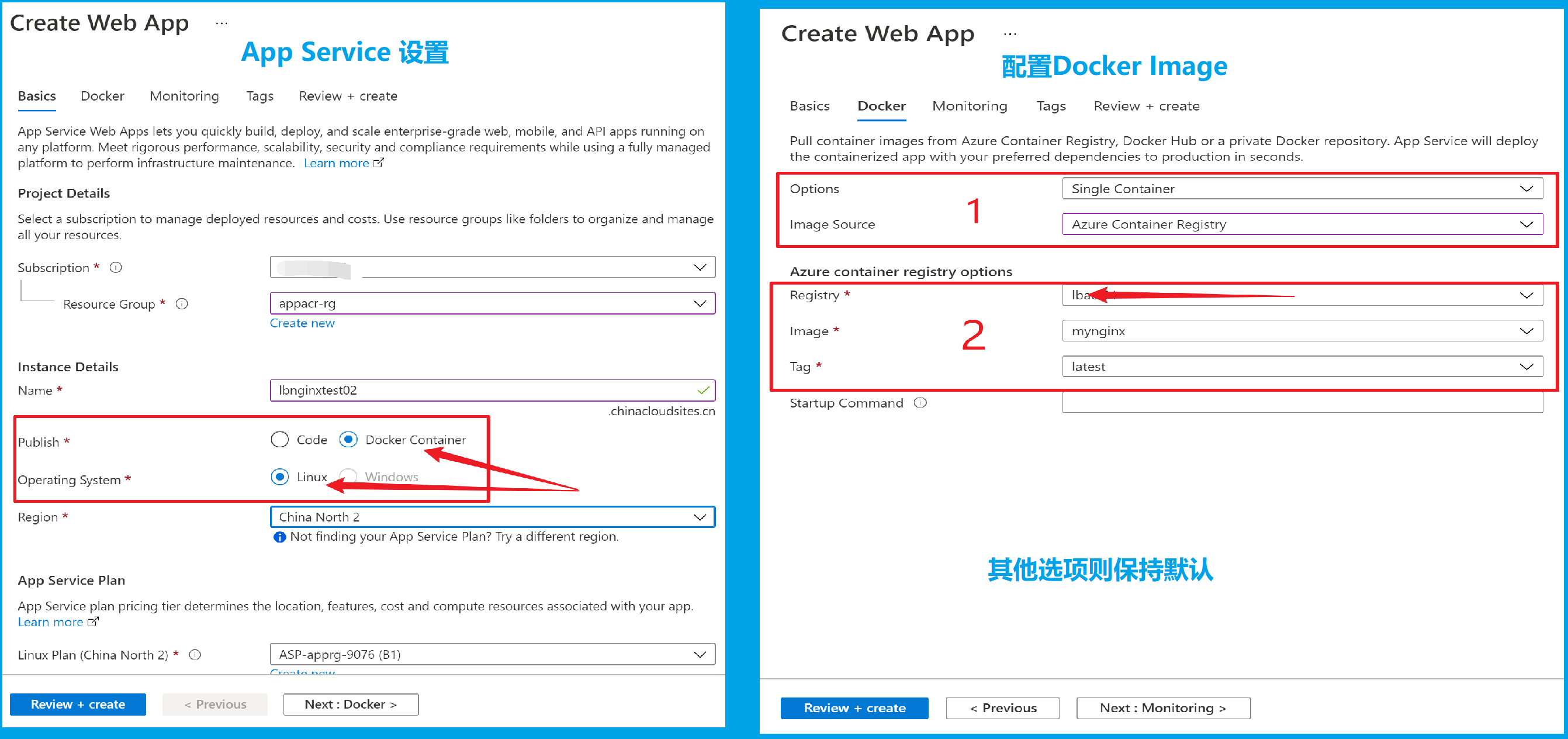 **注意:**整个操作根据Azure门户提示一步一步进行。 https://portal.azure.cn/#create/Microsoft.WebSite, 如要使用AZ命令,则同样参考第三步链接(将应用服务配置为从注册表部署映像:https://docs.microsoft.com/zh-cn/azure/app-service/tutorial-custom-container?pivots=container-linux#configure-app-service-to-deploy-the-image-from-the-registry)