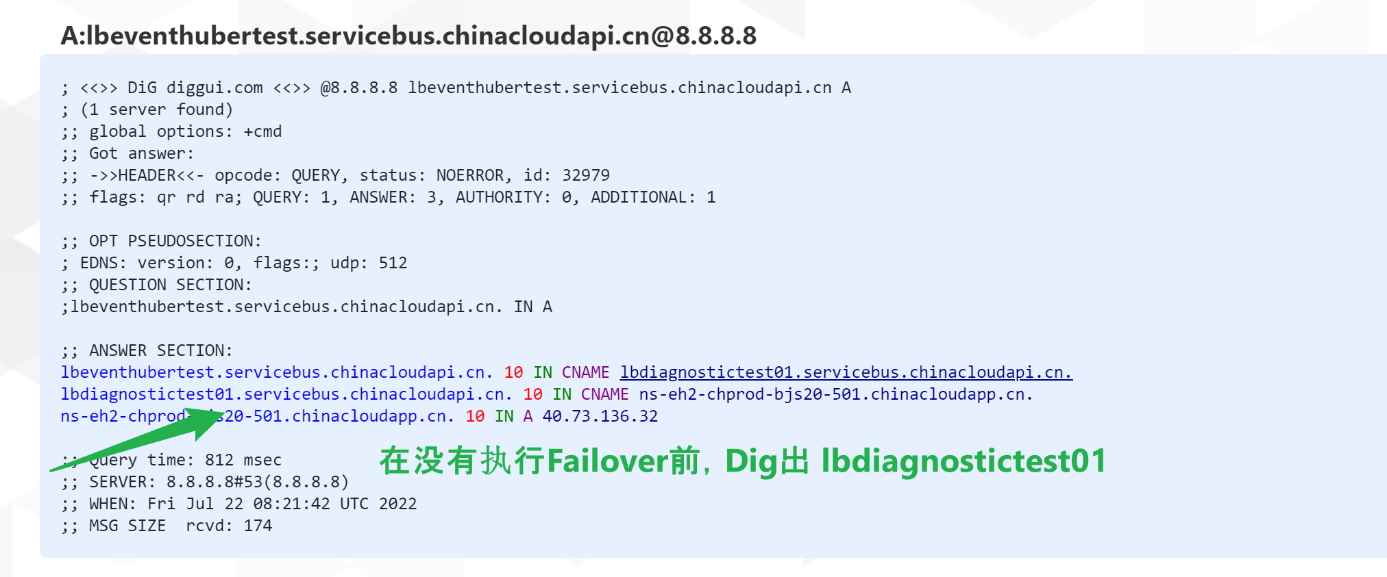 在执行前,可以通过在线Dig工具,查看当前的Alias域名(lbeventhubertest.servicebus.chinacloudapi.cn)解析出来的Host指向的为 lbdiagnostictest01