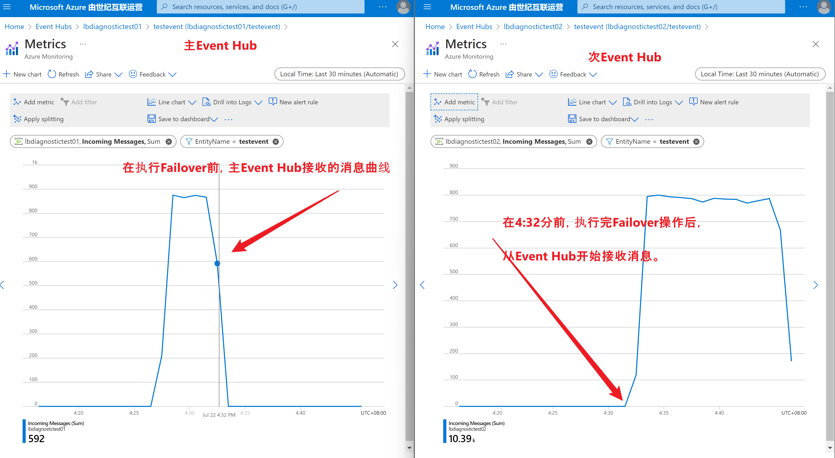 分别在主/从 Event Hub页面中进入Metrics页面,查看Incoming Message的曲线