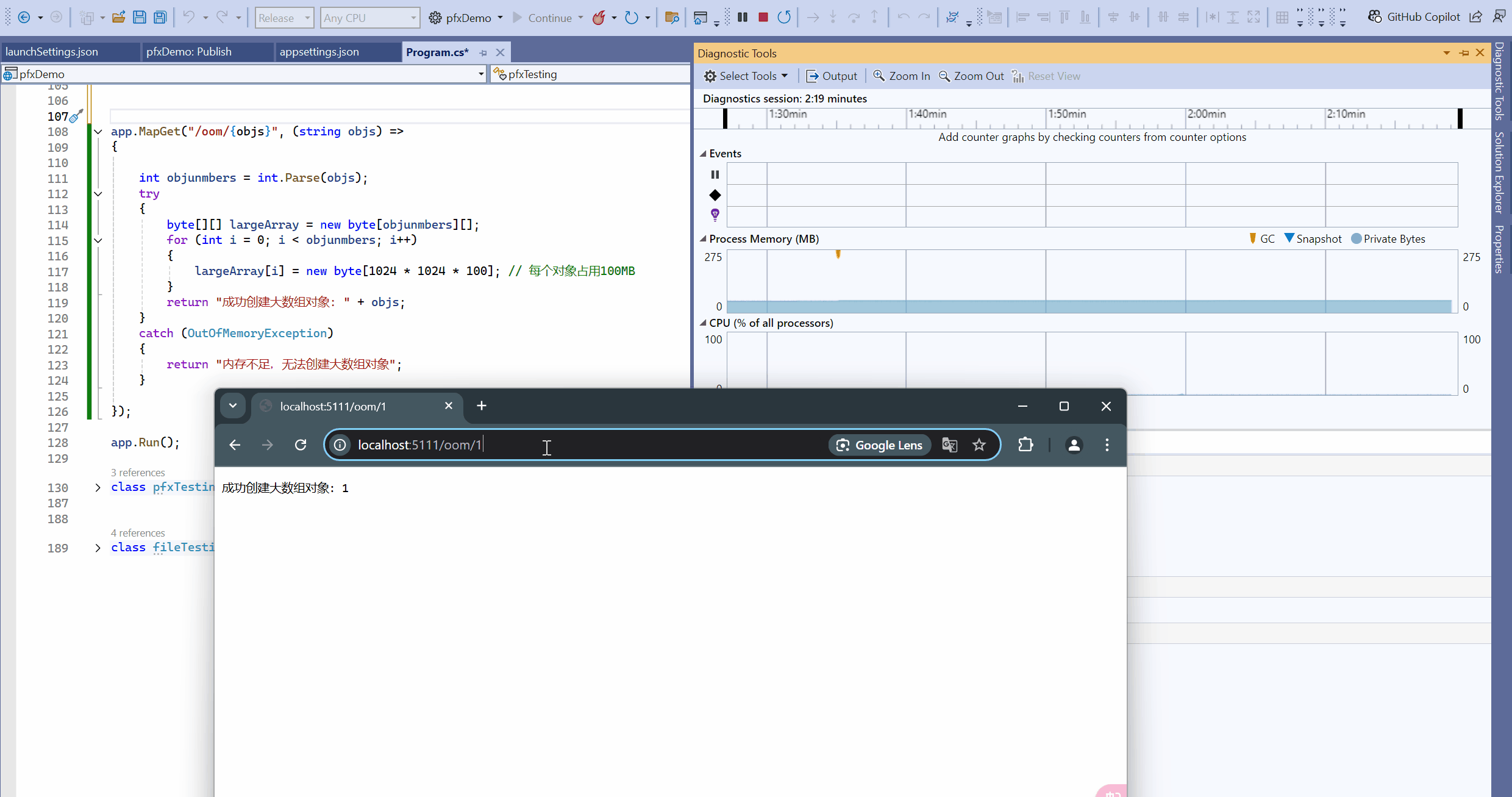 使用一段简短C#代码来进行验证,代码是一个循环,根据URL中输入的数字,循环创建多个100MB大小的对象.