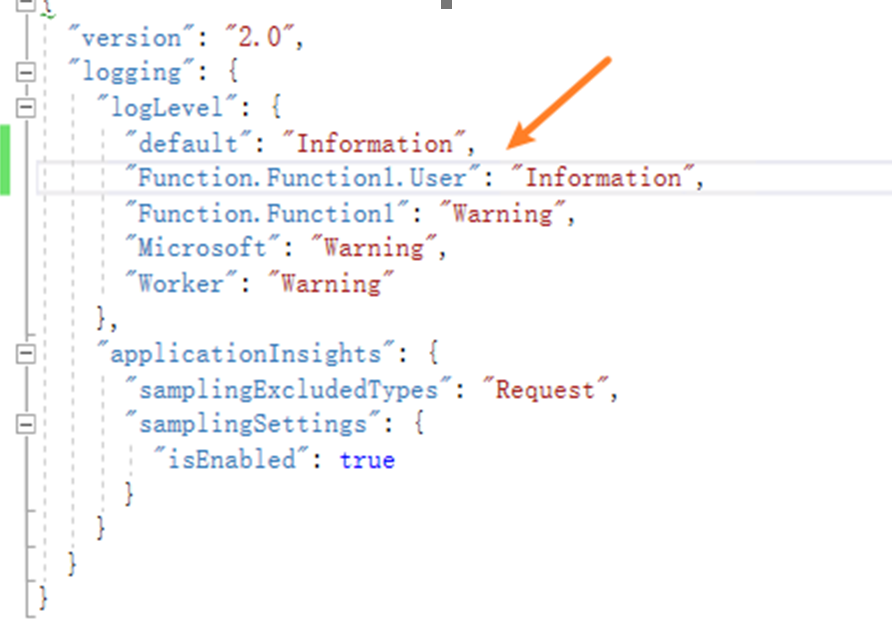 Application Insights收集日志信息是根据在Azure Function中的host.json配置而决定的。如以下内容: