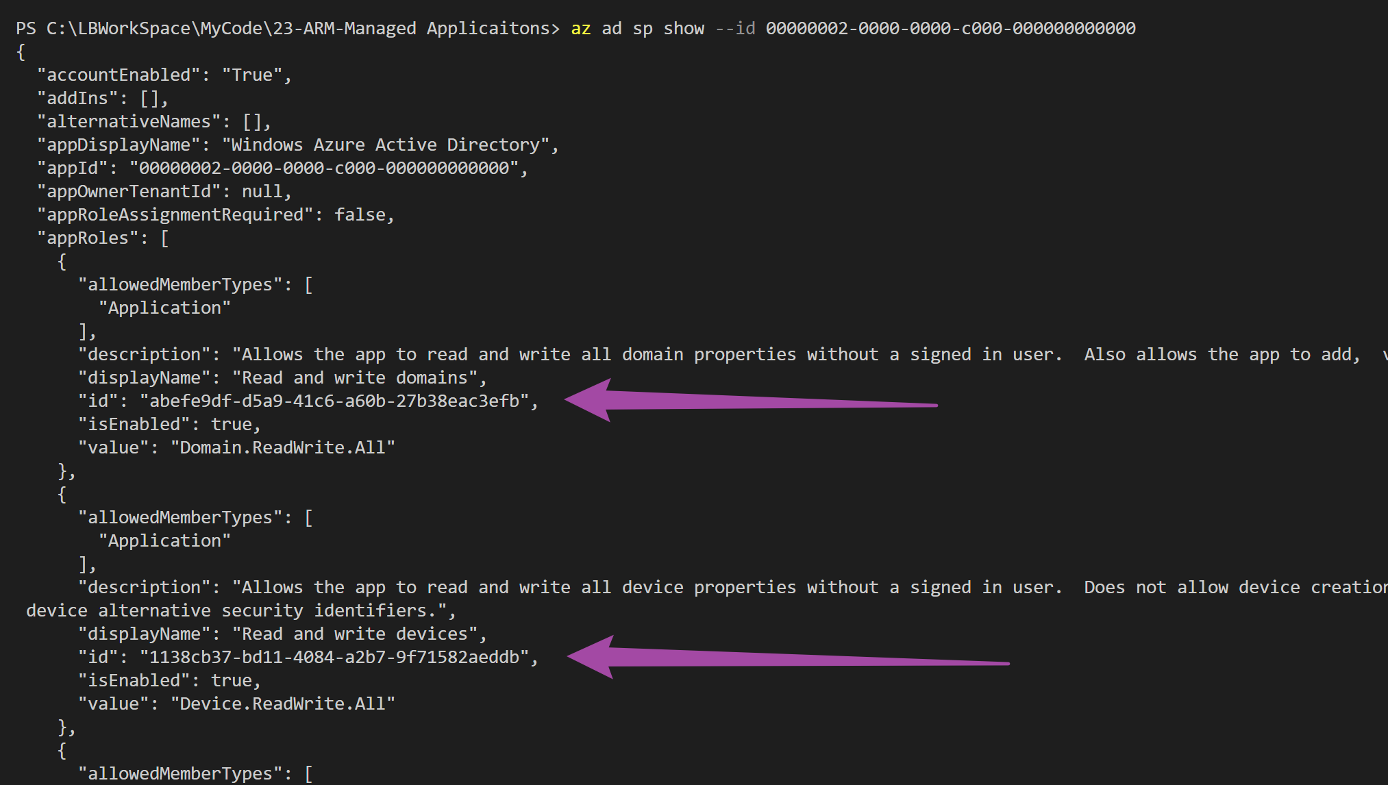 通过Azure CLI指令: az ad sp show --id 00000002-0000-0000-c000-000000000000 , 过滤出结果zhozho能够的 Role ID。