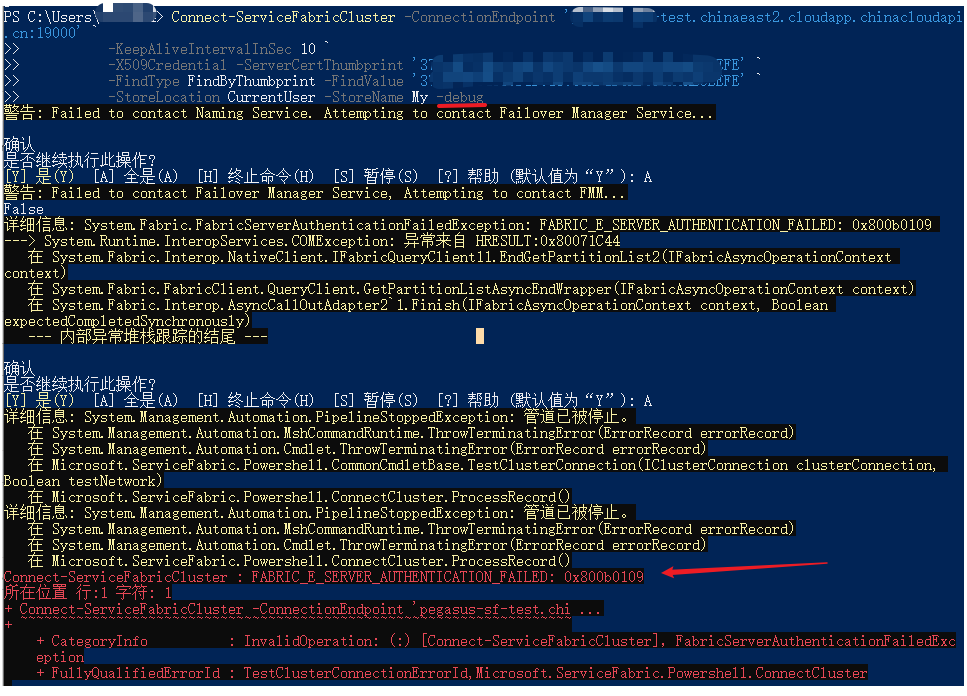 Azure Service Fabric提供了PowerShell的指令来进行创建,管理资源,如Get-ServiceFabricClusterHealth 获取当前集群的健康状态,但这些命令都需要使用Connect-ServiceFabricCluster 先连接到集群。而在使用连接命令时候,始终连接不成功。本且是运行PowerShell命令的机器上已经安装了SF的主要证书。通过添加 -debug命令查看输出结果,不能连接成功的原因为认证失败。[System.Fabric.FabricServerAuthenticationFailedException: FABRIC_E_SERVER_AUTHENTICATION_FAILED: 0x800b0109]