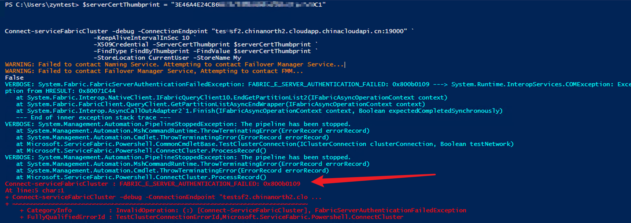 详细信息: System.Fabric.FabricServerAuthenticationFailedException: FABRIC_E_SERVER_AUTHENTICATION_FAILED: 0x800b0109