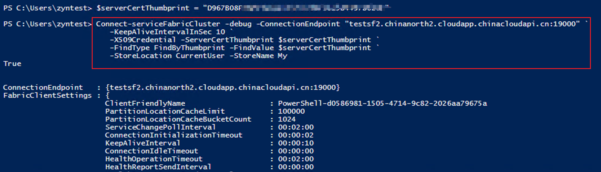 Connect-ServiceFabricCluster -ConnectionEndpoint 'sf-test.chinaeast2.cloudapp.chinacloudapi.cn:19000' `