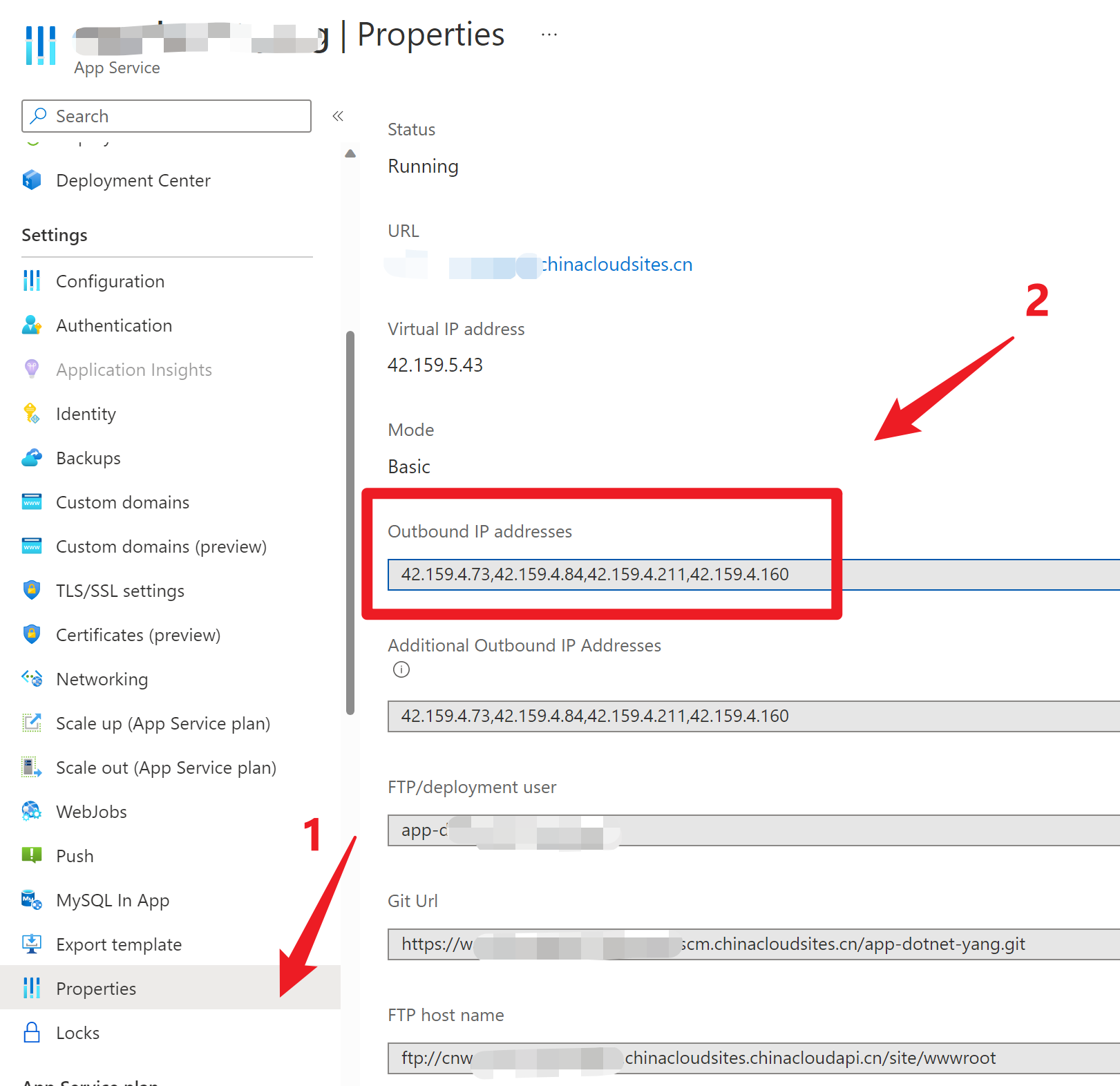 App Service 出站IP地址:https://docs.azure.cn/zh-cn/app-service/ip-address-change-outbound#find-the-outbound-ip-addresses-in-the-azure-portal