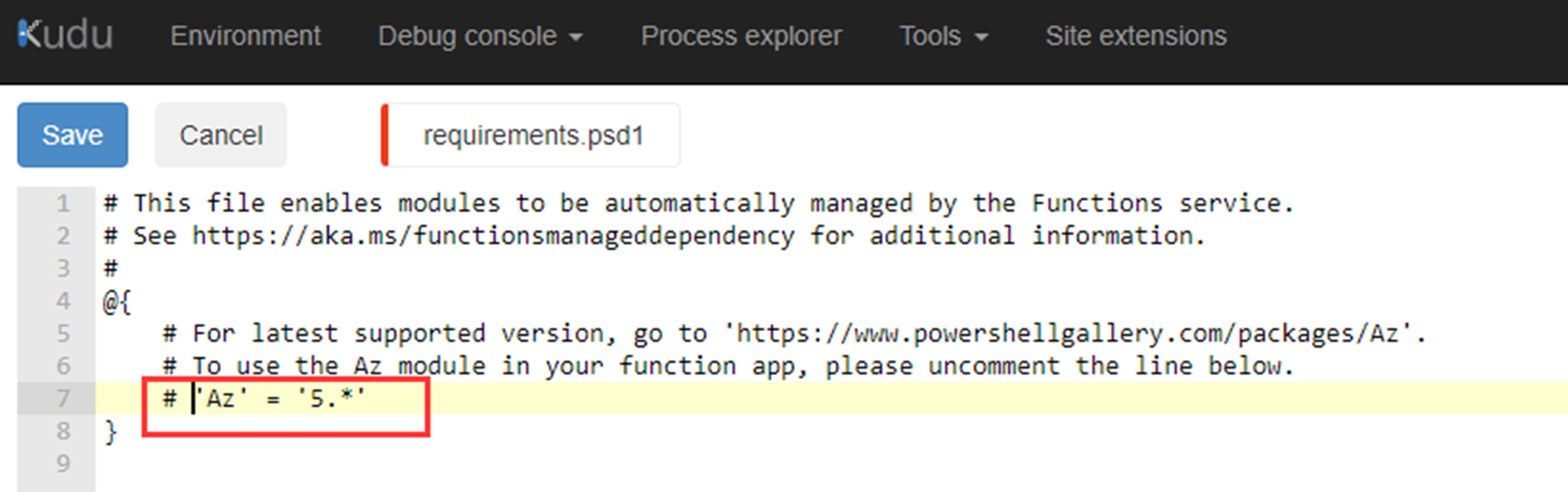 Functions 允许你利用 PowerShell 库来管理依赖项。 启用依赖项管理后,使用 requirements.psd1 文件来自动下载所需的模块。 启用此行为的方法是:在 host.json 文件的根目录中,将