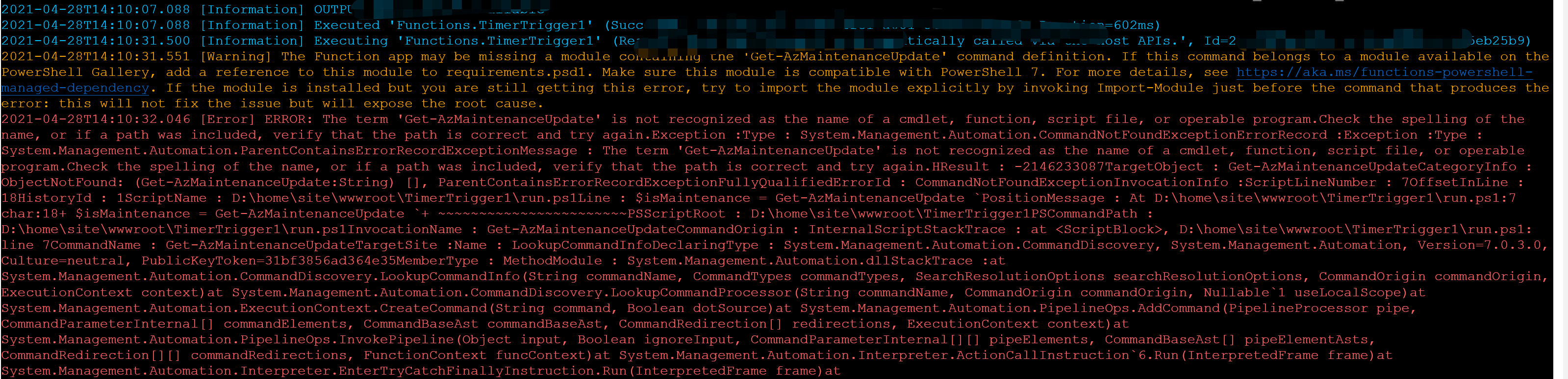 在Azure Function中创建一个PowerShell的函数后,其中使用了Get-AzMaintenanceUpdate,New-AzApplyUpdate 等指令,但是在执行时错误。错误截图: