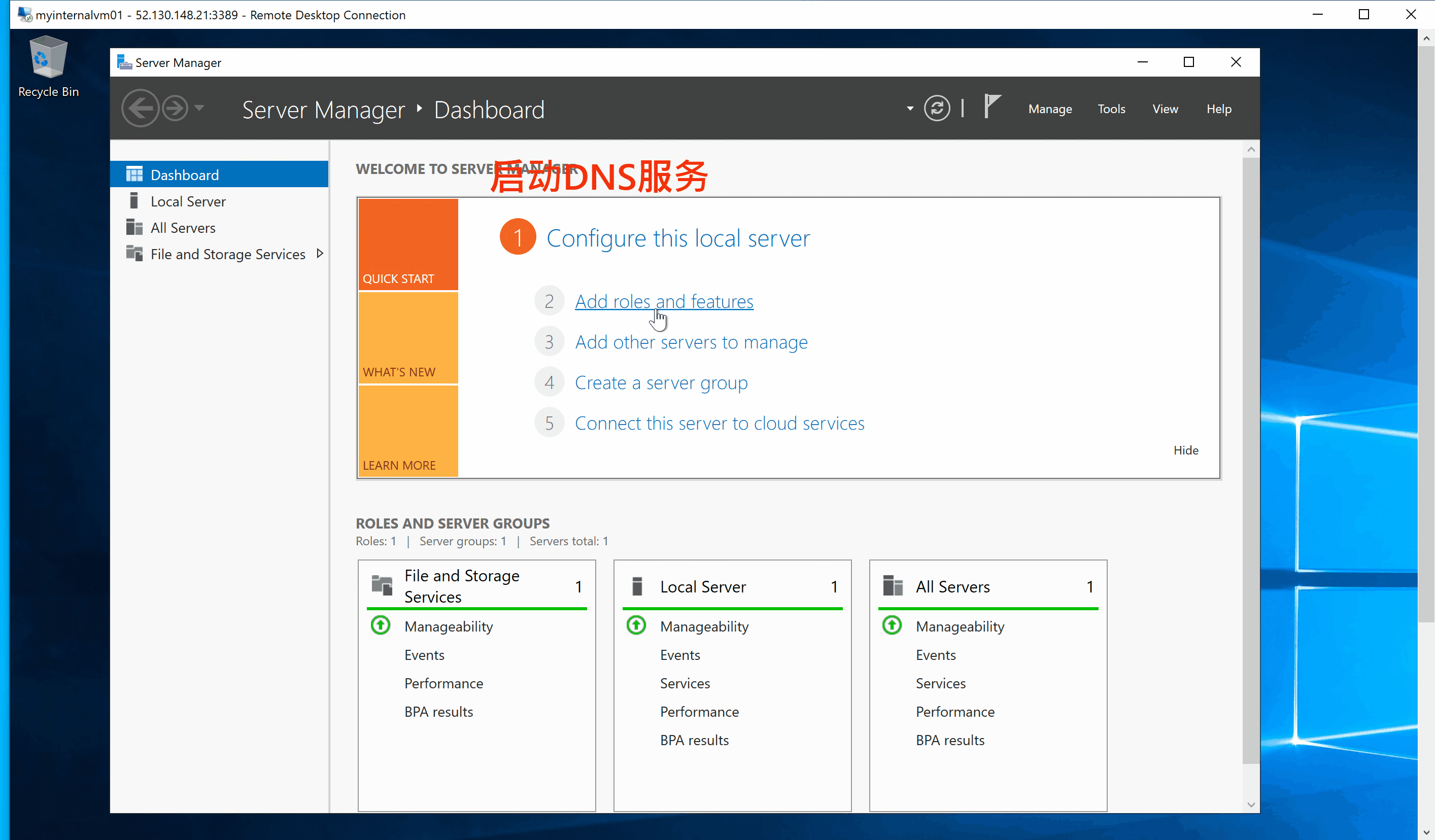 RDP到VM(myinternalvm01) 并启用DNS服务