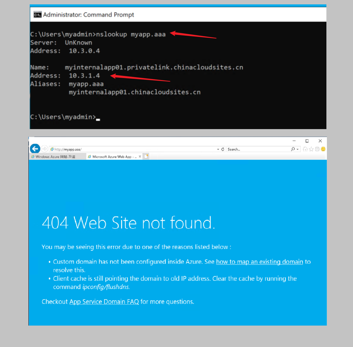 根据以上的步骤,已经可以通过默认的App Service域名访问成功。接下来的步骤就是配置内网的自定义域名。如myapp.aaa。如果在内网DNS中直接配置CNAME指向App Service默认域名,虽然通过nslookup或者nameresolver.exe解析能够指向App Service的内网IP,但是在访问时候会遇见404错误