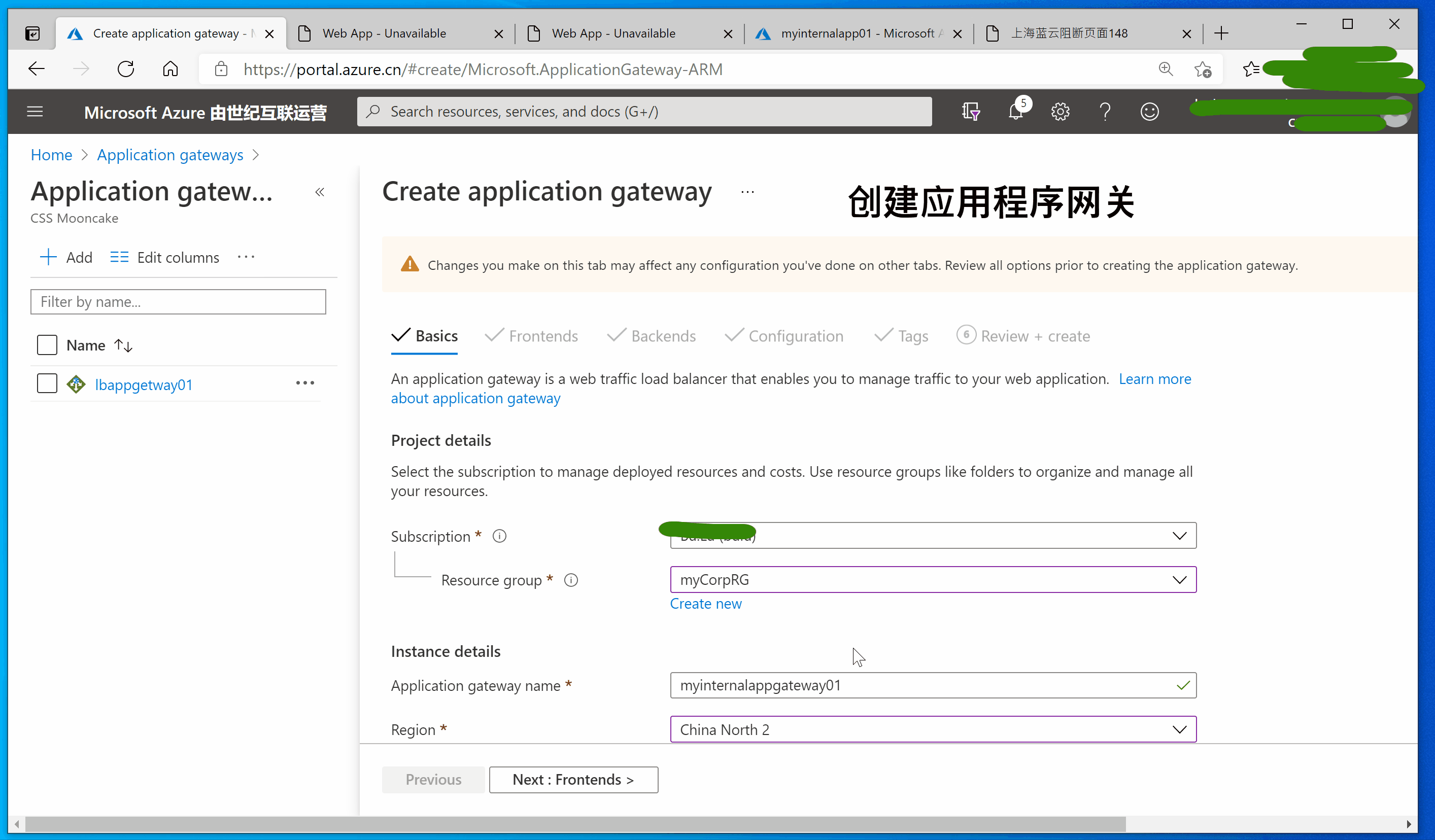 Application gateway name输入 myinternalappgateway01