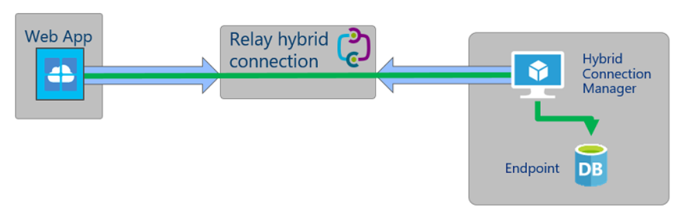 The Hybrid Connections feature consists of two outbound calls to Azure Service Bus Relay. There is a connection from a library on the host where your app is running in App Service. There is also a connection from the Hybrid Connection Manager (HCM) to Service Bus Relay. The HCM is a relay service that you deploy within the network hosting the resource you are trying to access.