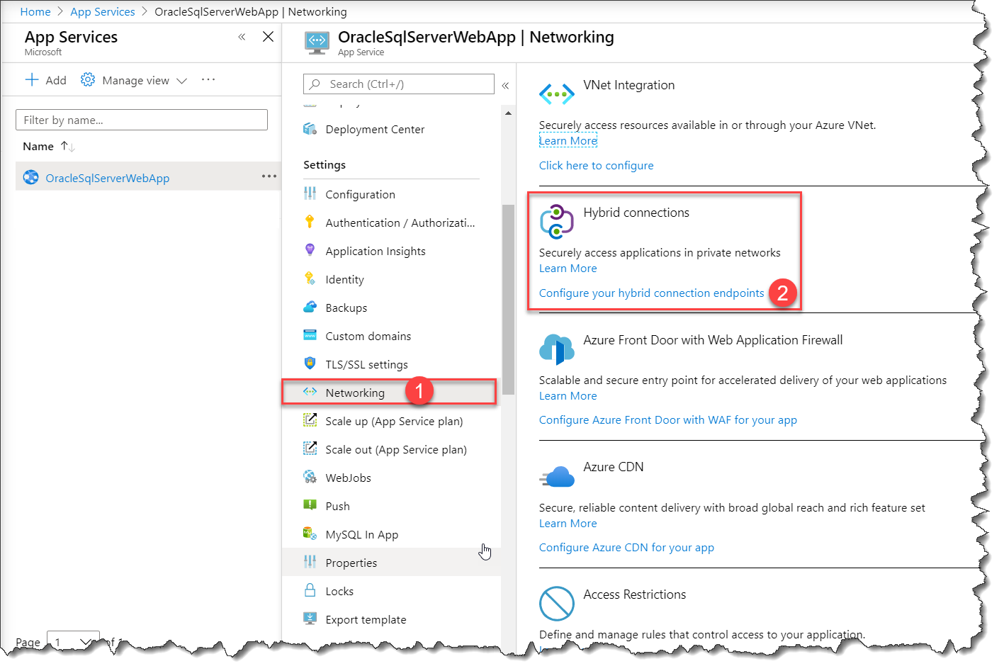 To create a Hybrid Connection, go to the Azure portal and select your App Service, then select Networking > Configure your Hybrid Connection endpoints. Here you can see the Hybrid Connections that are configured for your app.
