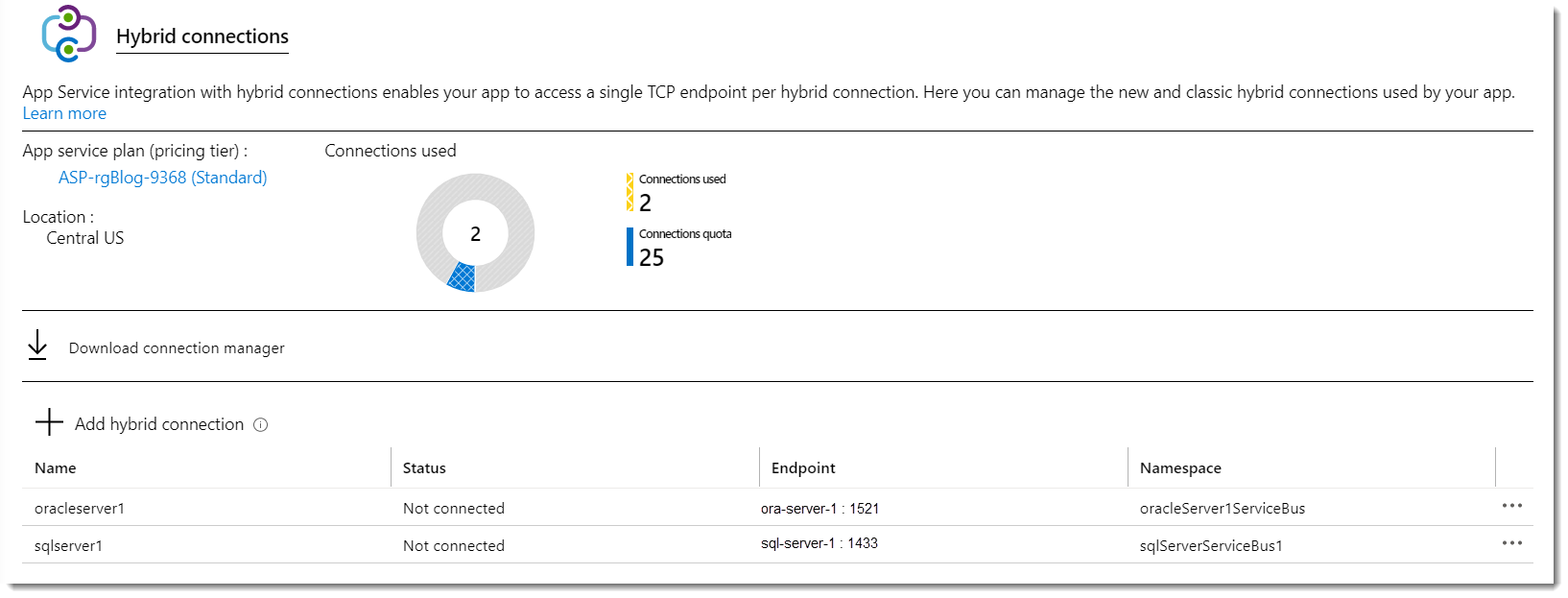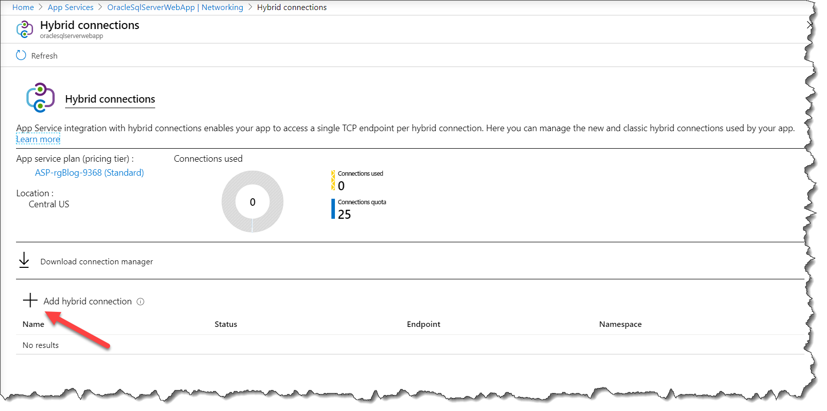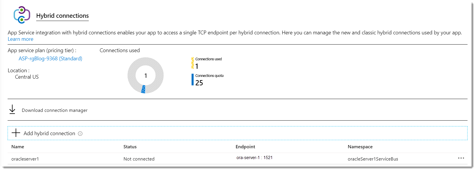 IMPORTANT NOTE: App Service Hybrid Connections are only available in Basic, Standard, Premium, and Isolated pricing SKUs. There are limits tied to the pricing plan. If you have an account through your Visual Studio subscription, you usually have a limit of 5 hybrid connections. In my case I can create up-to 25 hybrid connections for my account as you can see in the screenshot above.