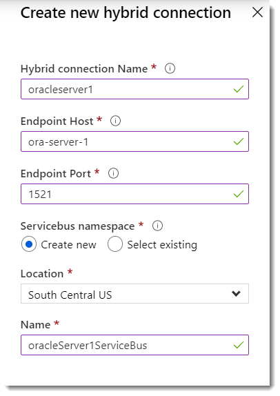 In the Create new hybrid connection blade, you must fill in the following fields for your Oracle server hybrid connection: