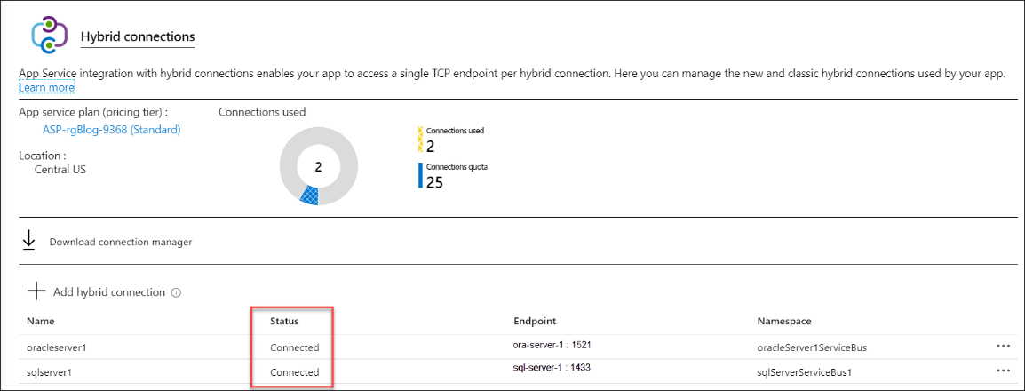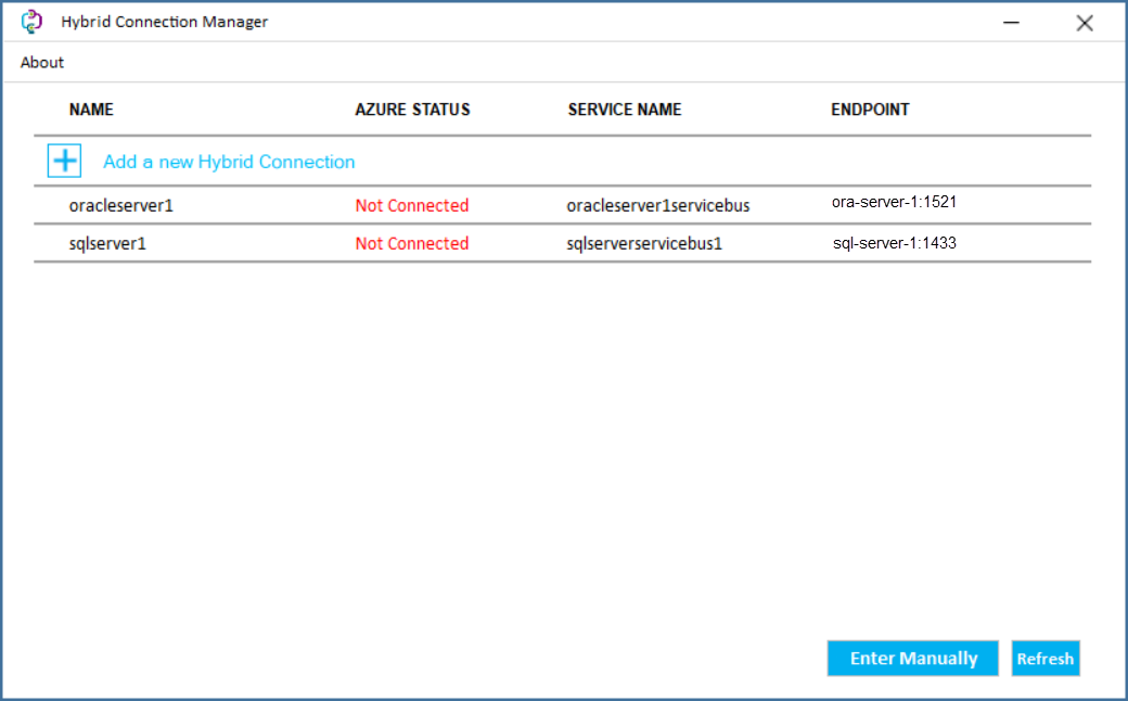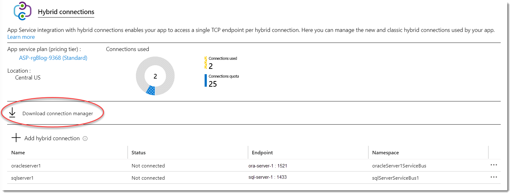 After creating the SQL Server hybrid connection, you should see the following hybrid connections list. Note that both connections‘ status is “Not connected“: