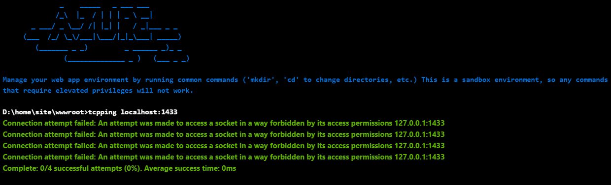 You did not have to reboot the computer to have this working, but the restart is needed to see that it connected in HCM. In some cases, based on your company‘s security policy, you might never see the status as connected. If you want to test if the hybrid connection is working, we have some tools to do that. In the Azure Portal under the App Service, click on the Console. This console is running under a sandbox and you can use it to check hybrid connection socket connectivity. Here is an example of the commands to use: