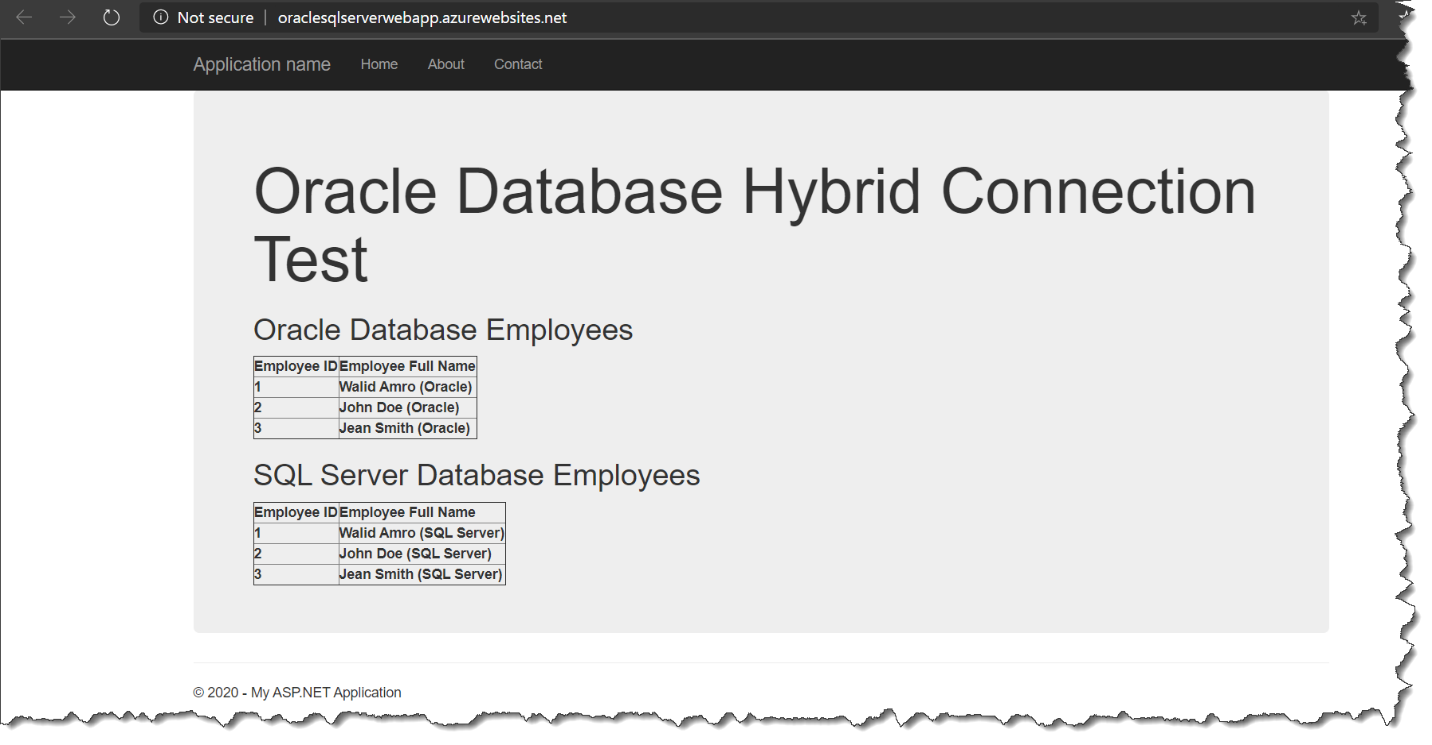 Publish the App Service and you should be able to access both on-premises Oracle server and SQL Server from the App Service. Here is how my test website looks:
