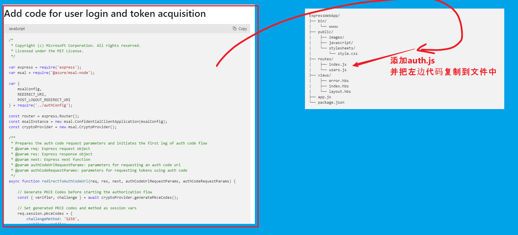 Tutorial: Sign in users and acquire a token for Microsoft Graph in a Node.js & Express web app: https://docs.microsoft.com/en-us/azure/active-directory/develop/tutorial-v2-nodejs-webapp-msal