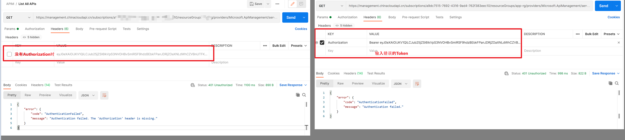 缺少Token和Token错误的截图(使用Postman测试调用Get APIM API List的接口:GET https://management.chinacloudapi.cn/subscriptions/{subscriptionId}/resourceGroups/{resourceGroupName}/providers/Microsoft.ApiManagement/service/{serviceName}/apis?api-version=2019-12-01)
