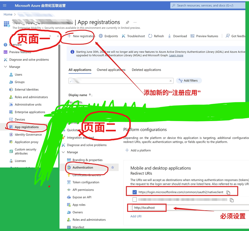 **注意:**添加Platform的时候选择Mobile and desktop applications,并且设置Redirect URIs 为 https://login.microsoftonline.com/common/oauth2/nativeclient 和 http://localhost