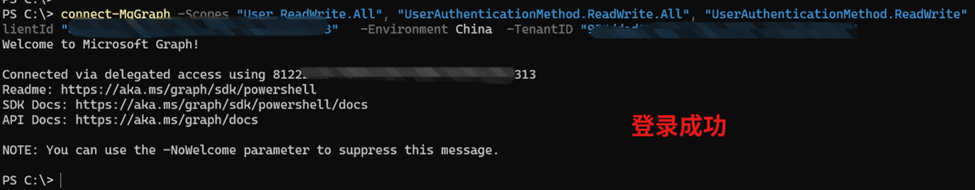 在Connect-MgGraph命令中使用第一步创建的 Client Id 和 Tenant Id 值,执行如下命令,即可登录成功。
