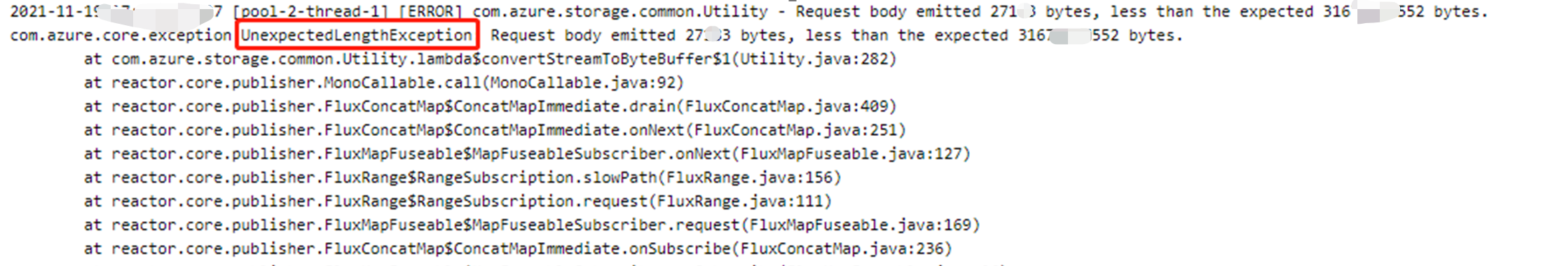 错误二:com.azure.core.exception UnexpectedLengthException Request body emitted 27183 bytes, less than the expected 31671447552 bytes.