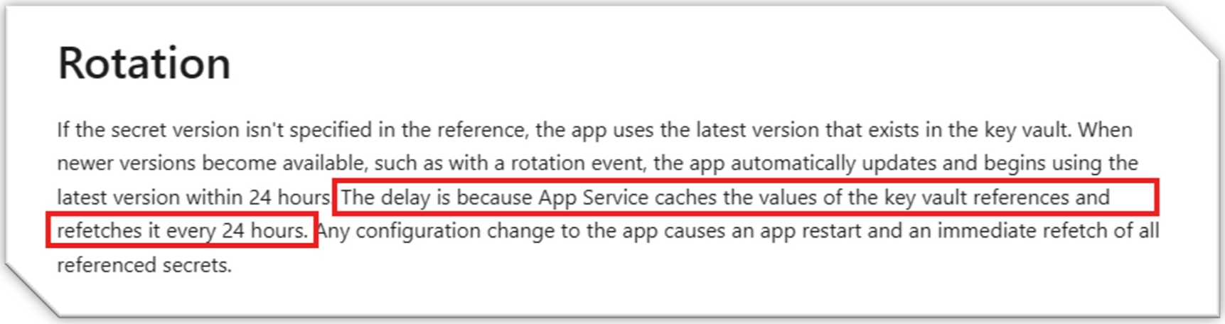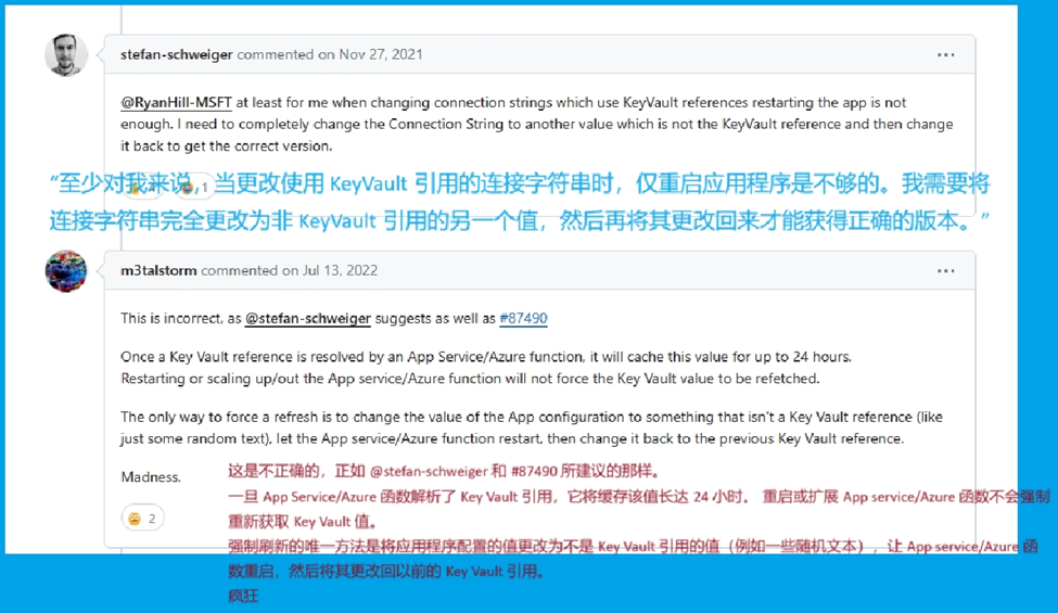 例如:KeyVault references - are returned values cached in the App Service : https://github.com/MicrosoftDocs/azure-docs/issues/36650