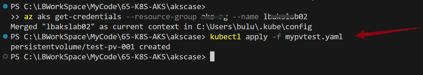 使用 kubectl apply -f mypvtest.yaml 部署PV到AKS中
