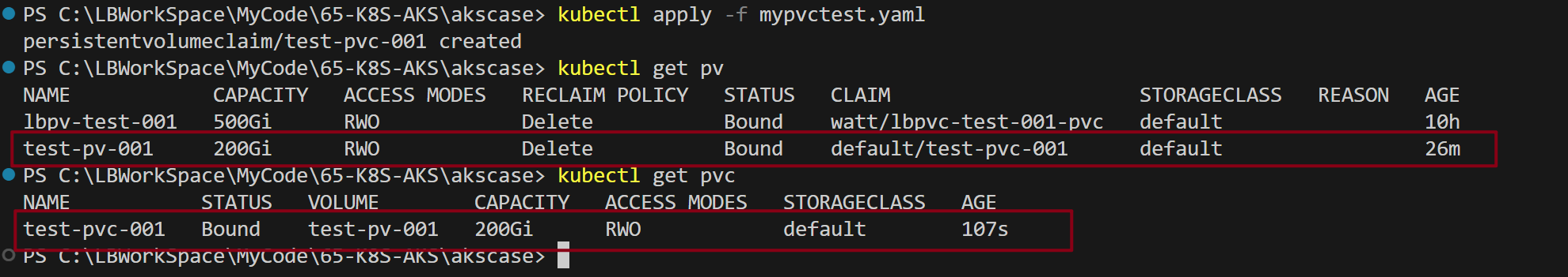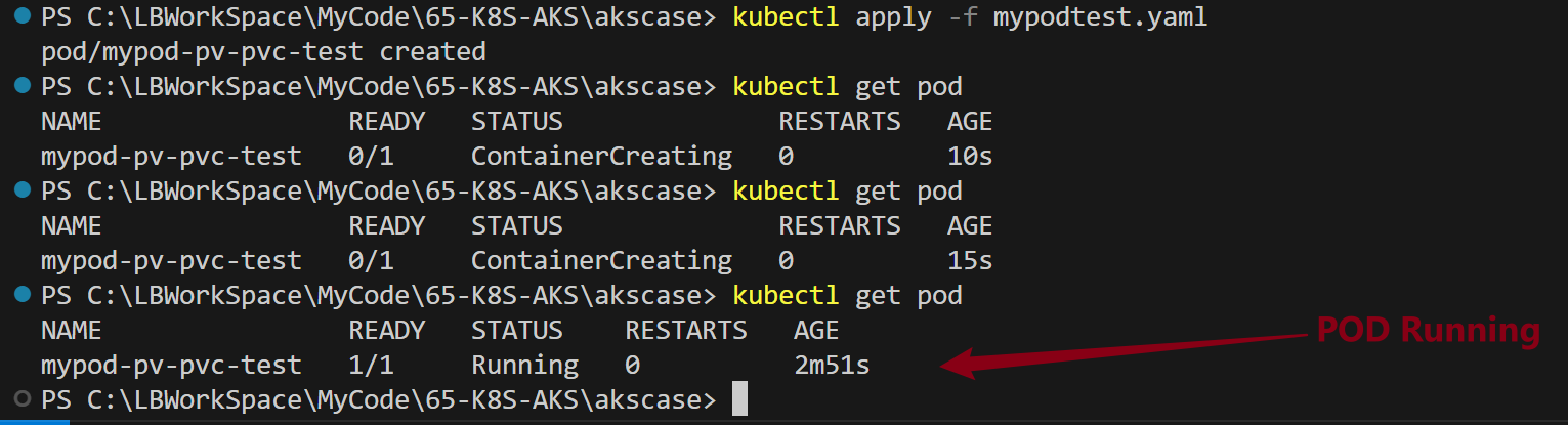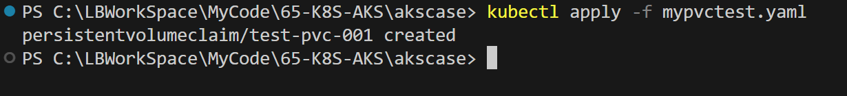 使用 kubectl apply -f mypvctest.yaml 部署PVC到AKS中