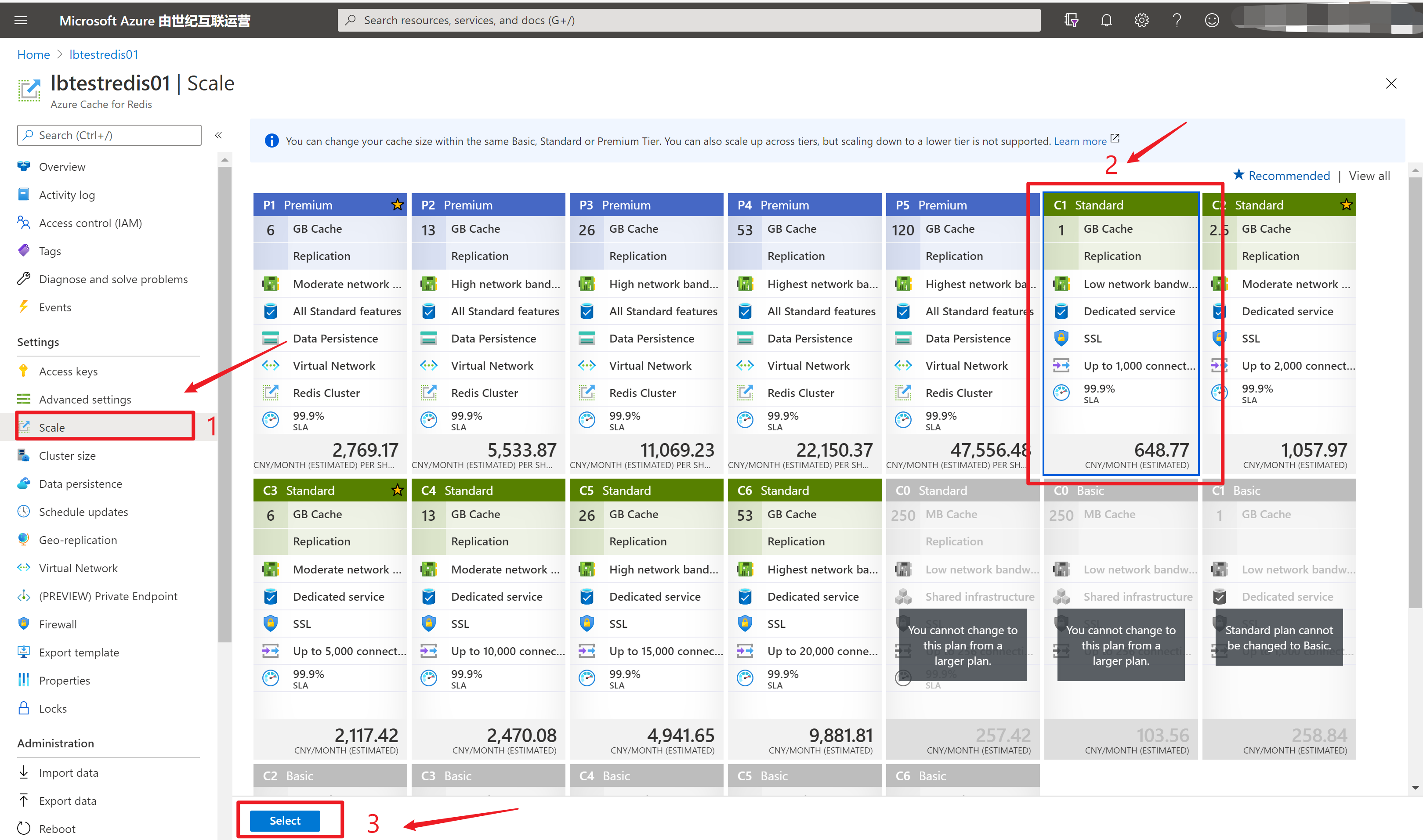 不能从 **高级 **缓存向下缩放到 **标准 **或 **基本 **缓存。