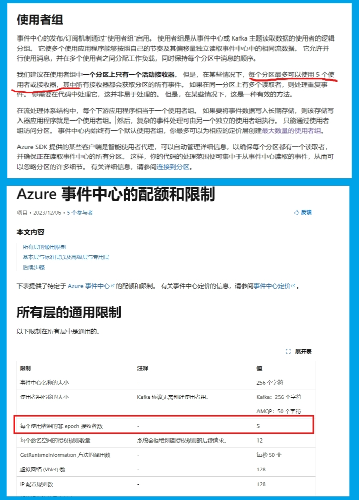 这是因为Event Hub对于同一个使用者组的限制:建议在使用者组中一个分区上只有一个活动接收器。 但是,在某些情况下,每个分区最多可以使用 5 个使用者或接收器,其中所有接收器都会获取分区的所有事件。