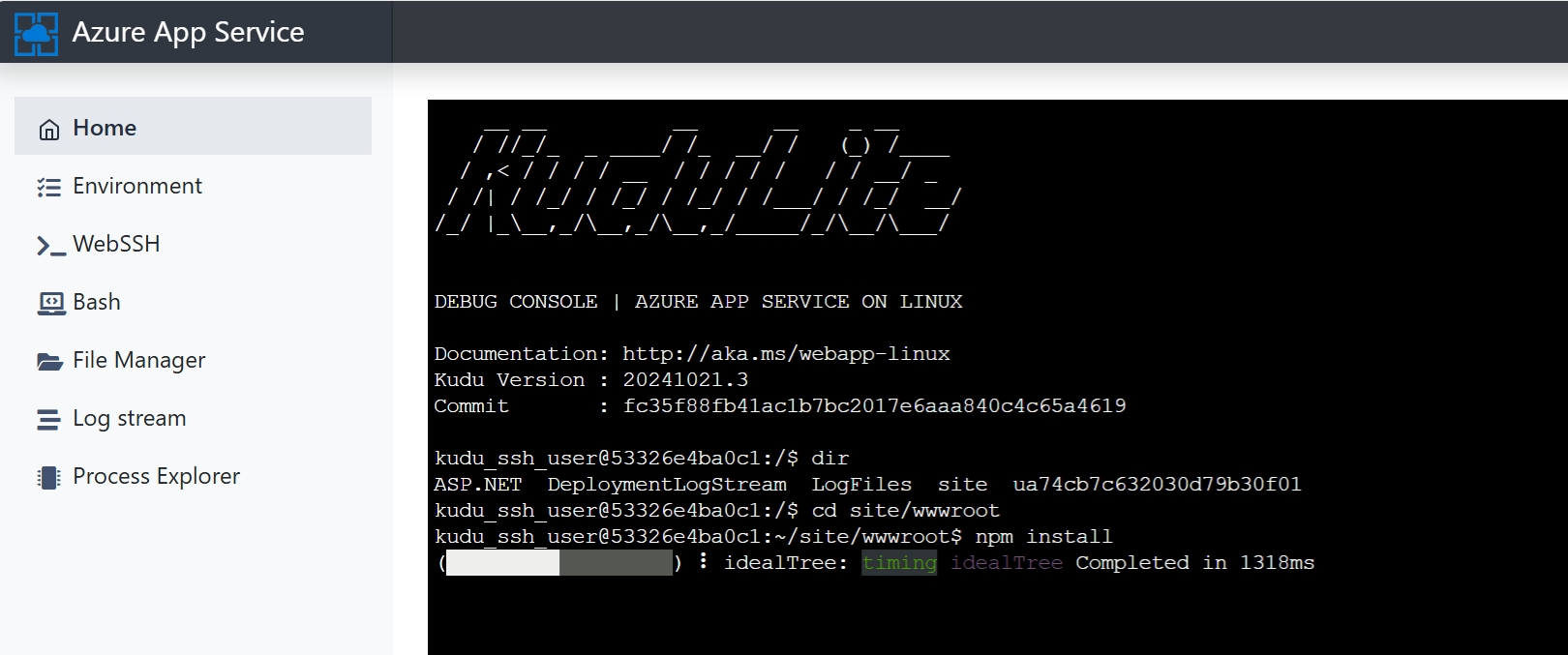 **方式二:**直接进入App Service的高级工具Kudu站点(https://<yourappservicename>.scm.chinacloudsites.cn/newui/kududebug), 进入wwwroot目录,执行 npm install