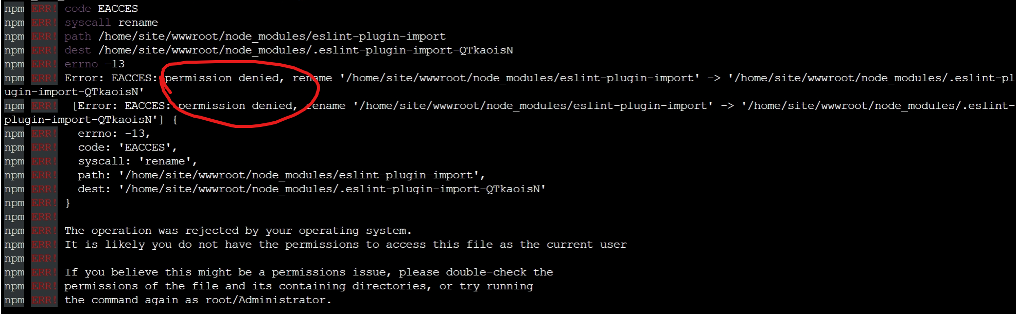 npm ERR! Error: EACCES: permission denied, rename '/home/site/wwwroot/node_modules/eslint-plugin-import' -> '/home/site/wwwroot/node_modules/.eslint-plugin-import-QTkaoisN'