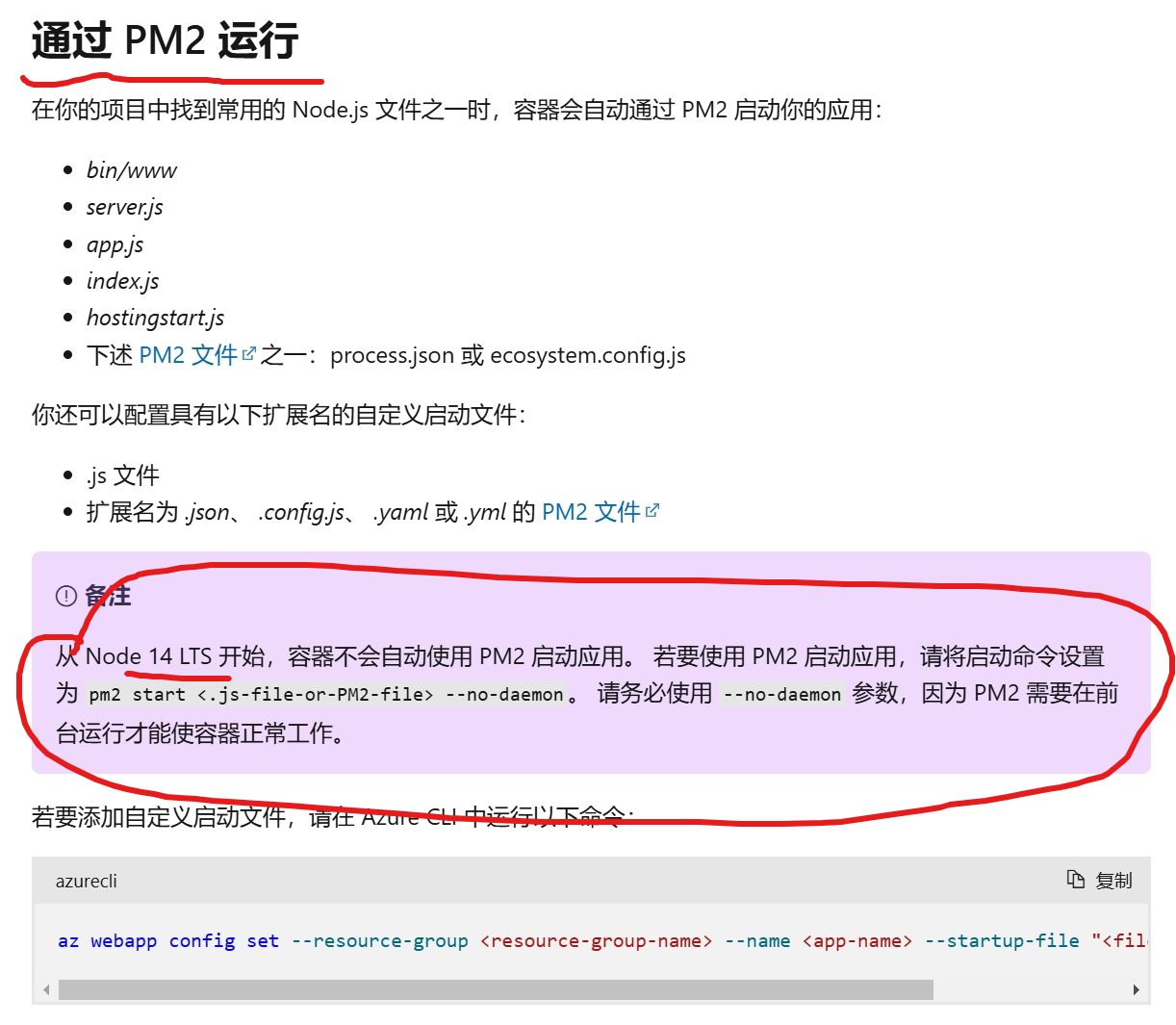 从 Node 14 LTS 开始,容器不会自动使用 PM2 启动应用。 若要使用 PM2 启动应用,请将启动命令设置为 pm2 start <.js-file-or-PM2-file> --no-daemon。