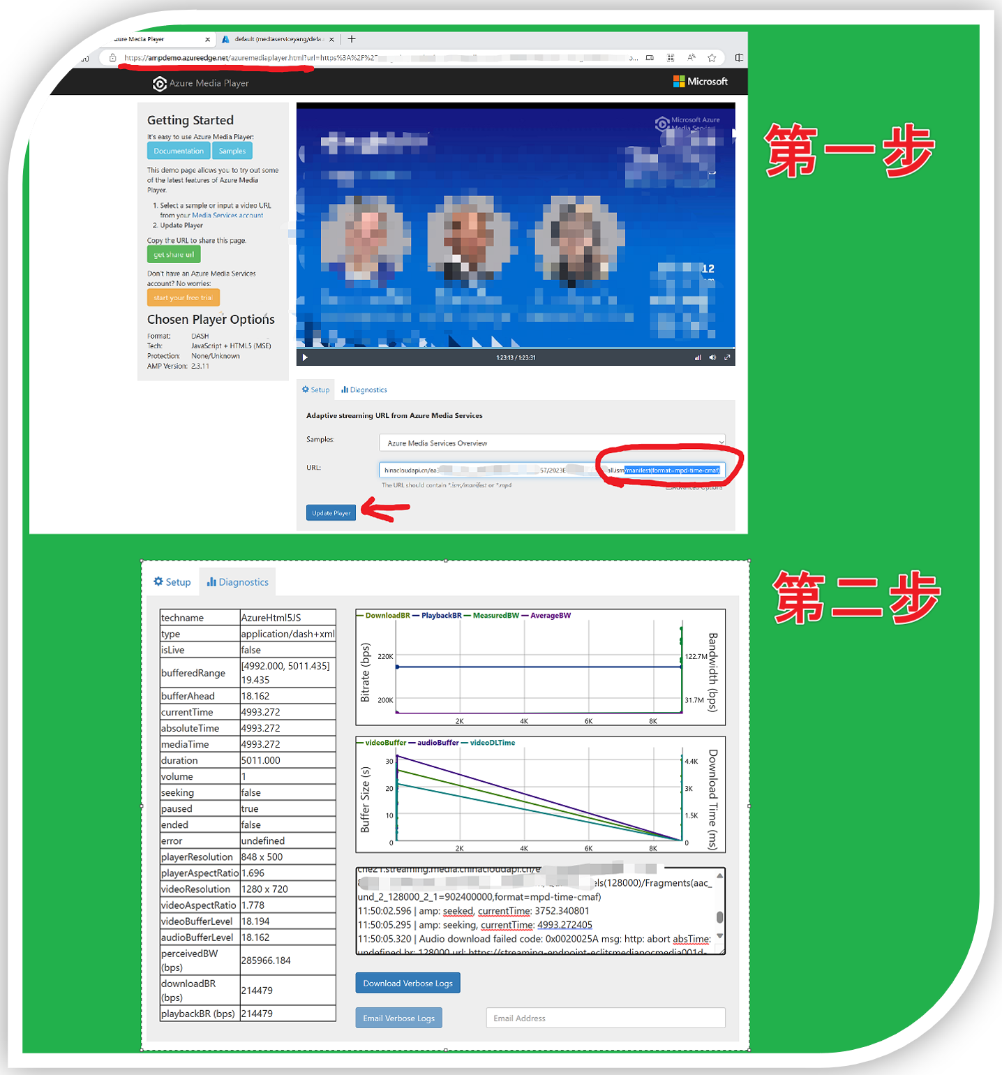使用AMP(Azure Media Player)播放器播放视频遇见问题时,可以通过它的诊断日志(Diagnostics)来查看具体的错误消息.