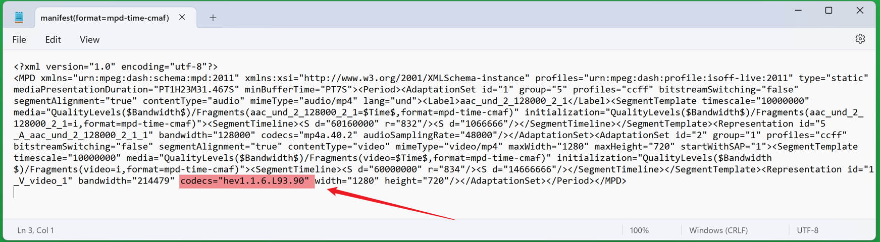 而且,查看视频的mainfest文件,其中也可以确认使用的 codecs 正是hev1.1.6.L93.90