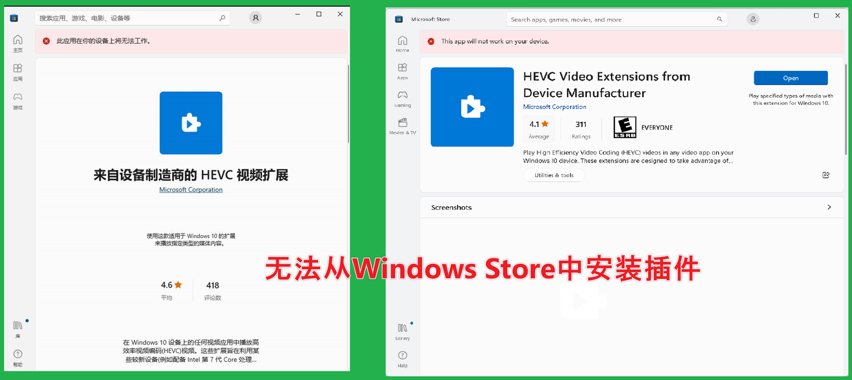 但是,当从Windows Store中安装 HEVC Extensions时,会遇见无法安装的问题: