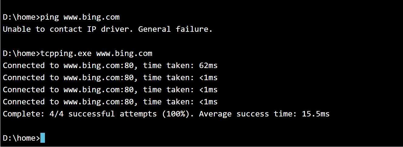 如果使用ping命令,则出现Unable to contact IP driver. General failure提示,所以可以使用tcpping.exe, 测试结果如下: