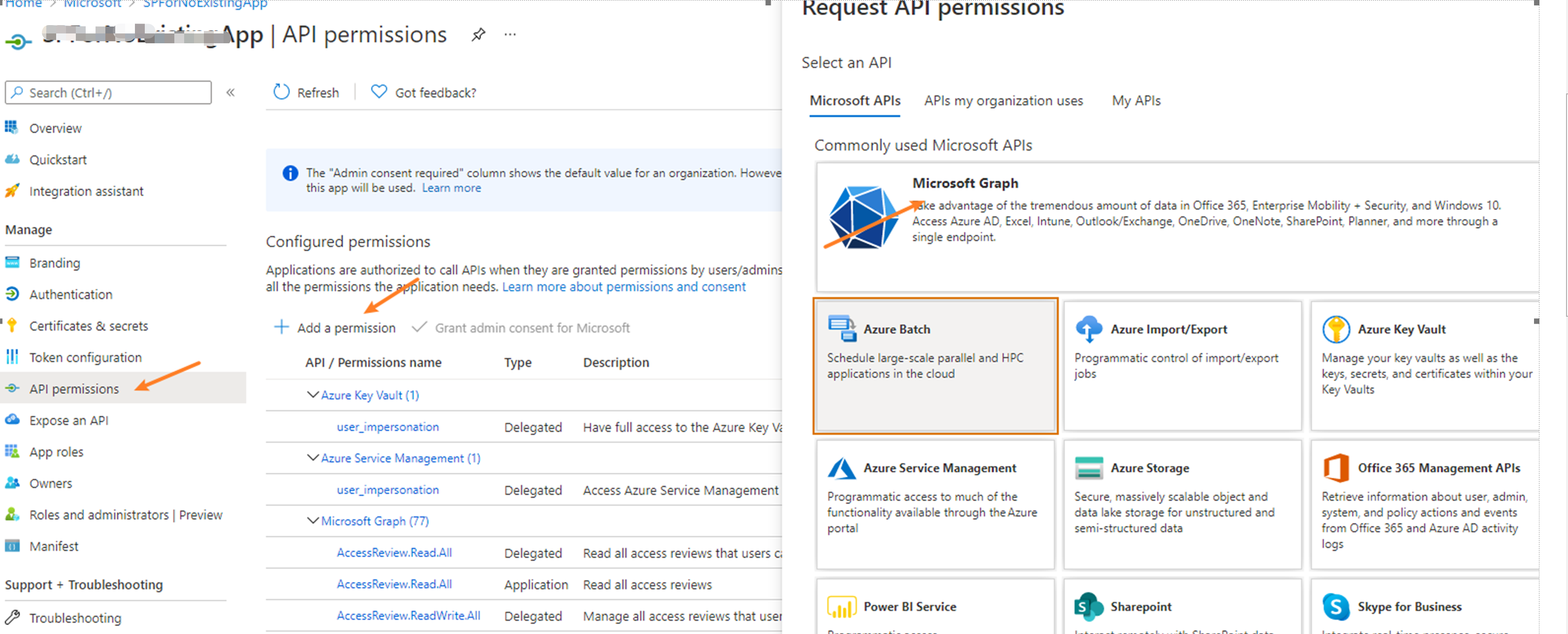 注意: 如果在运行代码时,遇见权限不足的问题,需要先确认AAD中所注册的应用(Registrations Application)是否有Microsoft Graph的相关权限.