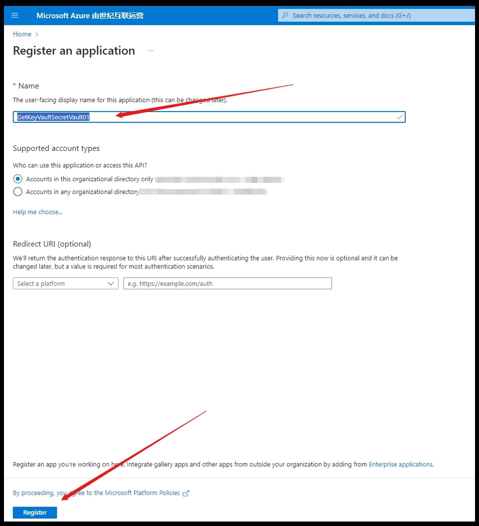 如取名“GetKeyVaultSecretVault01”,具体操作步骤,请参考:https://docs.azure.cn/zh-cn/entra/identity-platform/quickstart-register-app#register-an-application