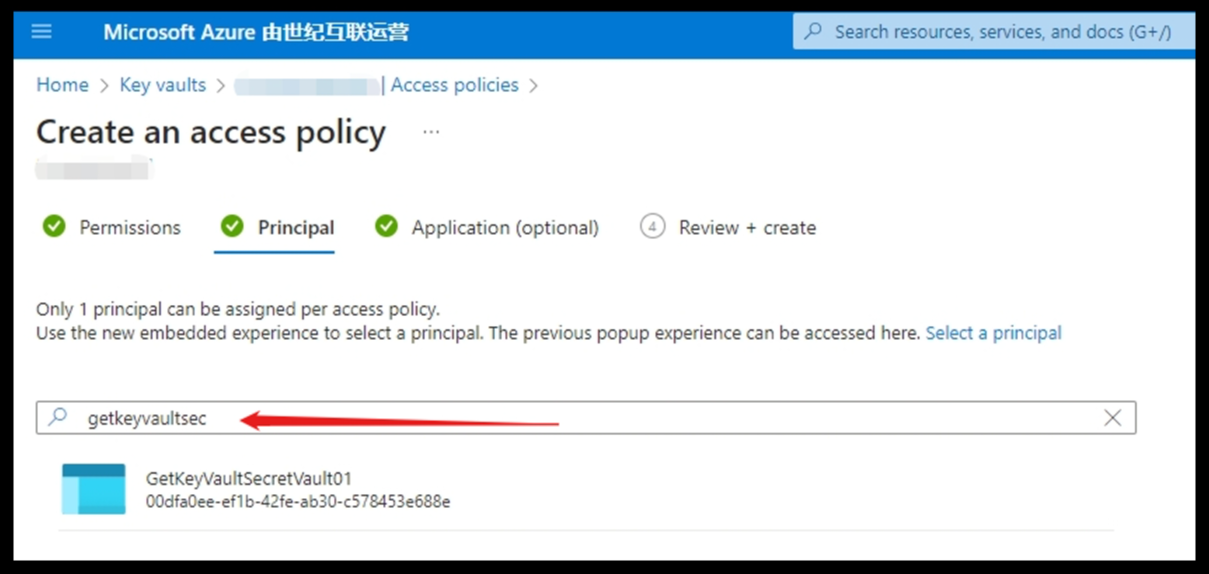 2)在Key Vault的Access Policy页面中,赋予Microsoft Entra ID的注册应用(Service Principal)的访问权限,具体操作步骤,请参考:https://docs.azure.cn/zh-cn/key-vault/general/assign-access-policy-portal