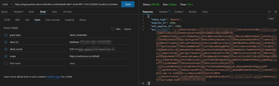 | grant_type : client_credentials client_id : <your Service Principal Client ID> client_secret : <your Service Principal Secret Value> scope : https://vault.azure.cn/.default |