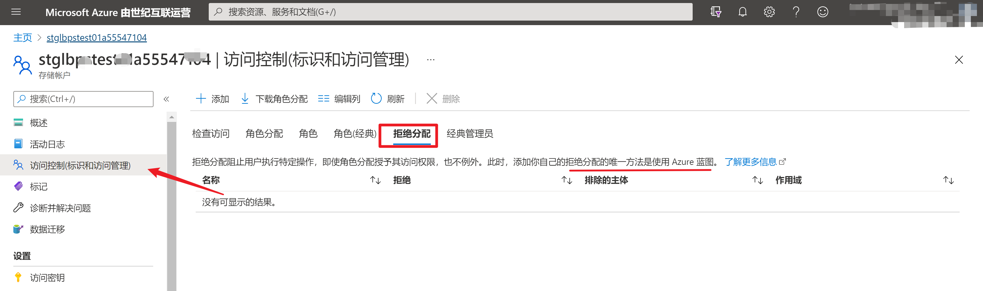 当打开Azure存储账号(Storage Account)门户页面时,从 “访问控制(标识和访问管理)” 页面中发现有“拒绝分配”的功能,所以就思考,是不是可以拒绝每一个用户对存储的读取权限呢?